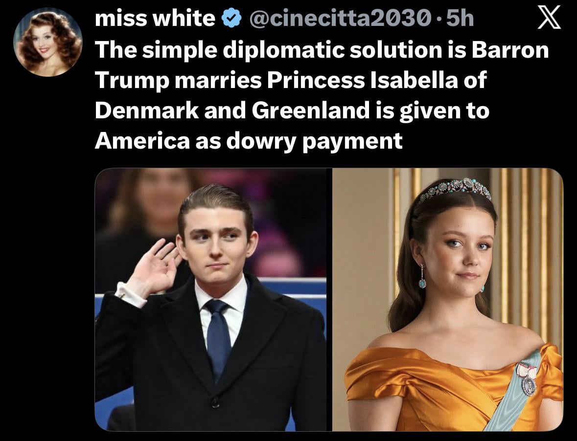 The simple diplomatic solution is Barron Trump marries Princess Isabella of Denmark and Greenland is given to America as dowry payment. Why royalty and arranged marriages existed. Posted by Now2Forever