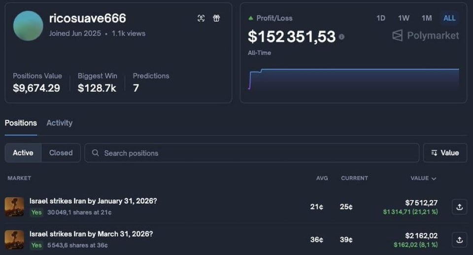Suspected Israeli insider account with a 100% win rate on polymarket (with all their bets being on Israeli military operations) has bet that Iran will be ATTACKED by Israel by January 31st