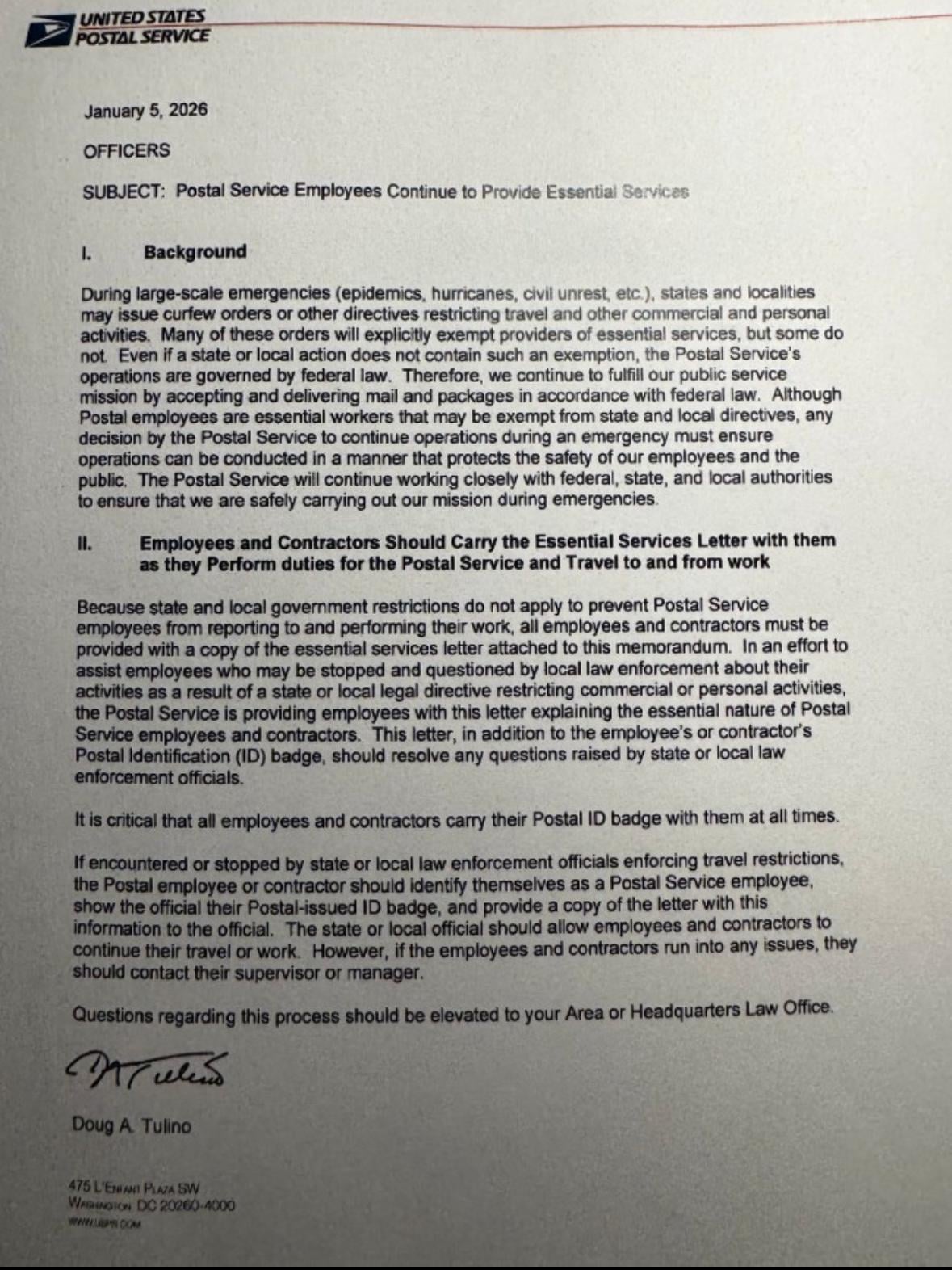Internal USPS notice. It tells all postal workers to carry an essential service letter to bypass travel restrictions during emergencies like epidemics, hurricanes, or civil unrest. Last time this went out was before Covid.