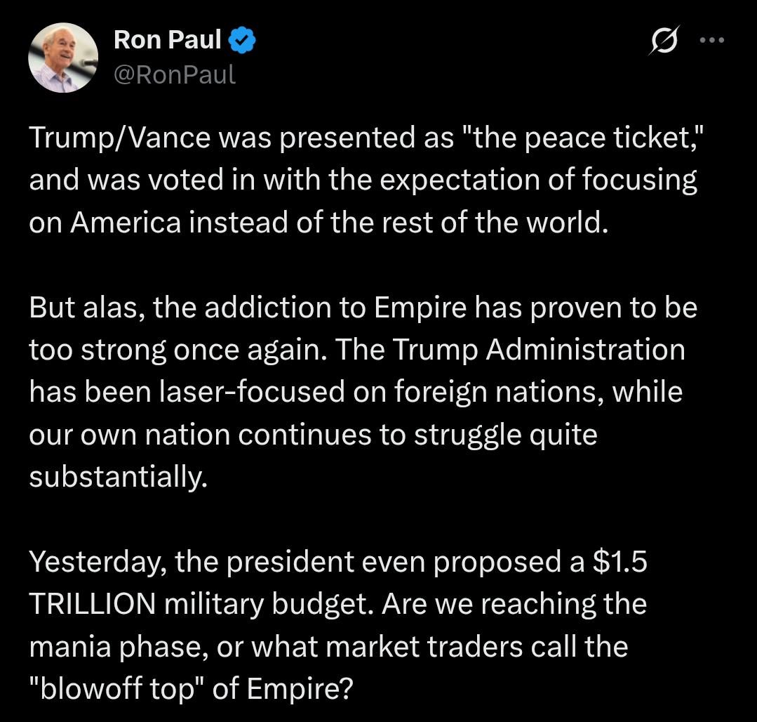 SS: Ron Paul is calling out the warmongers who lied their way into the office. We’re seeing more war and being told we love drug traffickers if we dare to wonder why the military industrial complex gets richer every day while ordinary Americans get poorer.