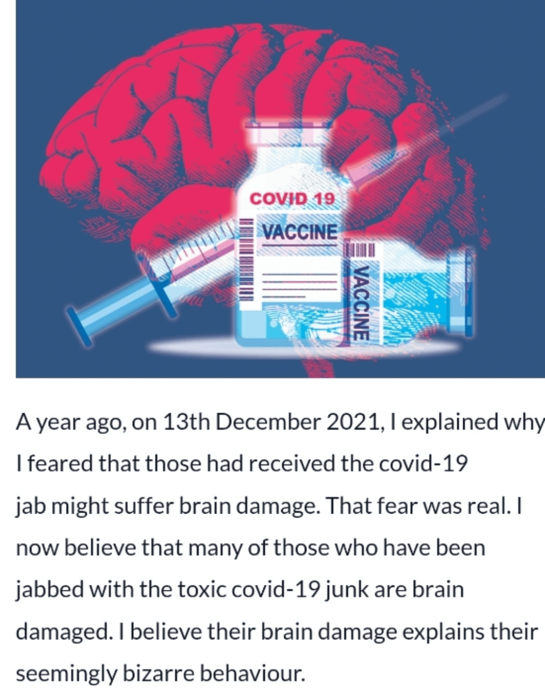 The covid injections harm people in a lot of ways, and one of the worst ones is the brain damage they have caused and continue causing. Unfortunately, the people who care the least about this are the ones who will be the most affected because they took the shots. They don’t even want to know.