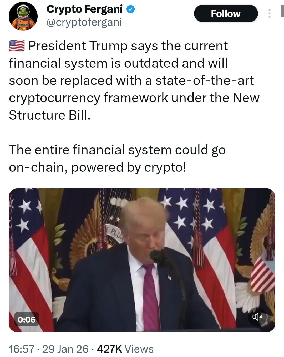 >President Trump says the current financial system is outdated and will soon be replaced with a state-of-the-art cryptocurrency framework under the New Structure Bill.