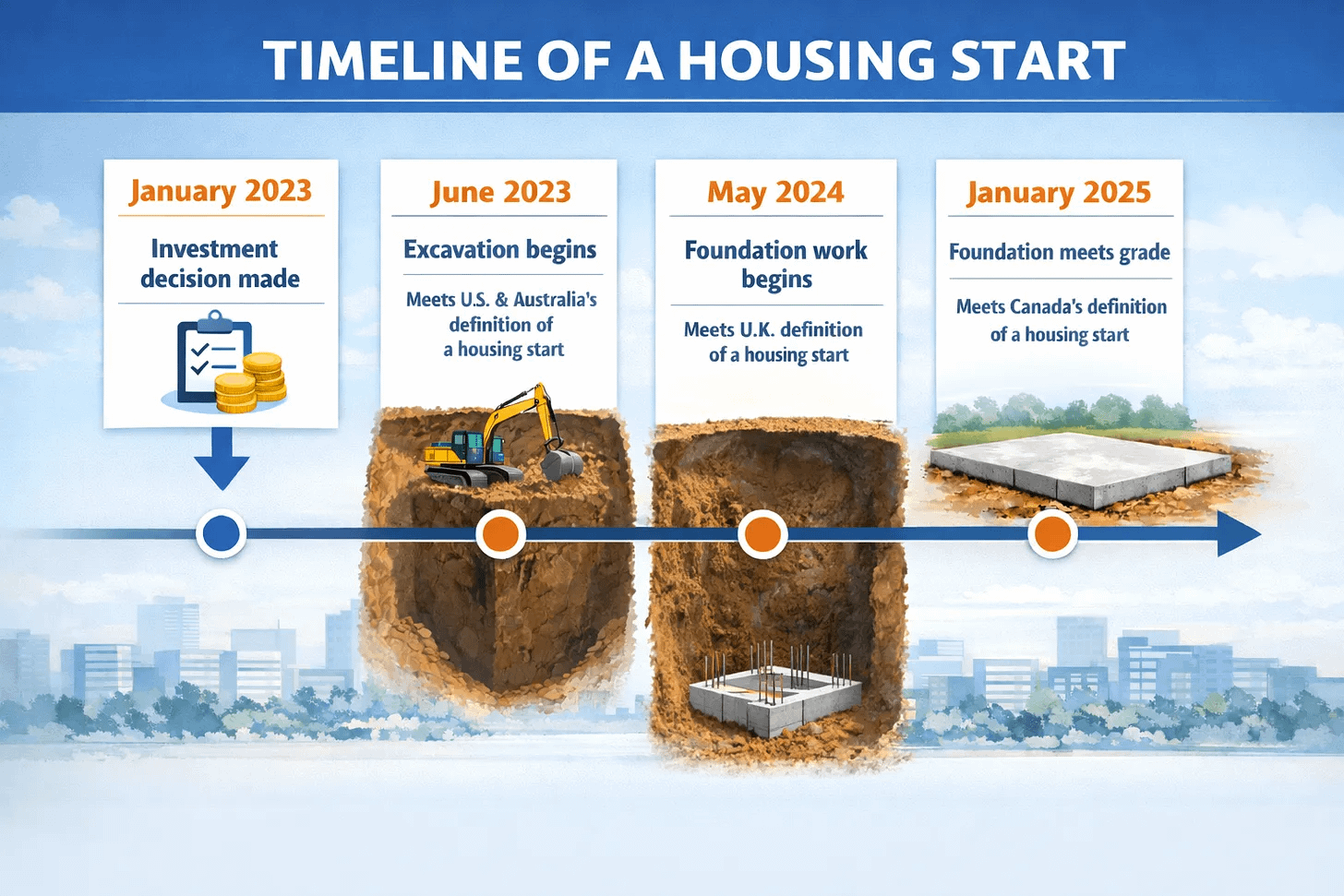 • “Housing starts” don’t mean what Canadians think they mean: Under the CMHC definition, construction can be underway for a year or more before a project is officially counted as having “started,” making the term deeply misleading.