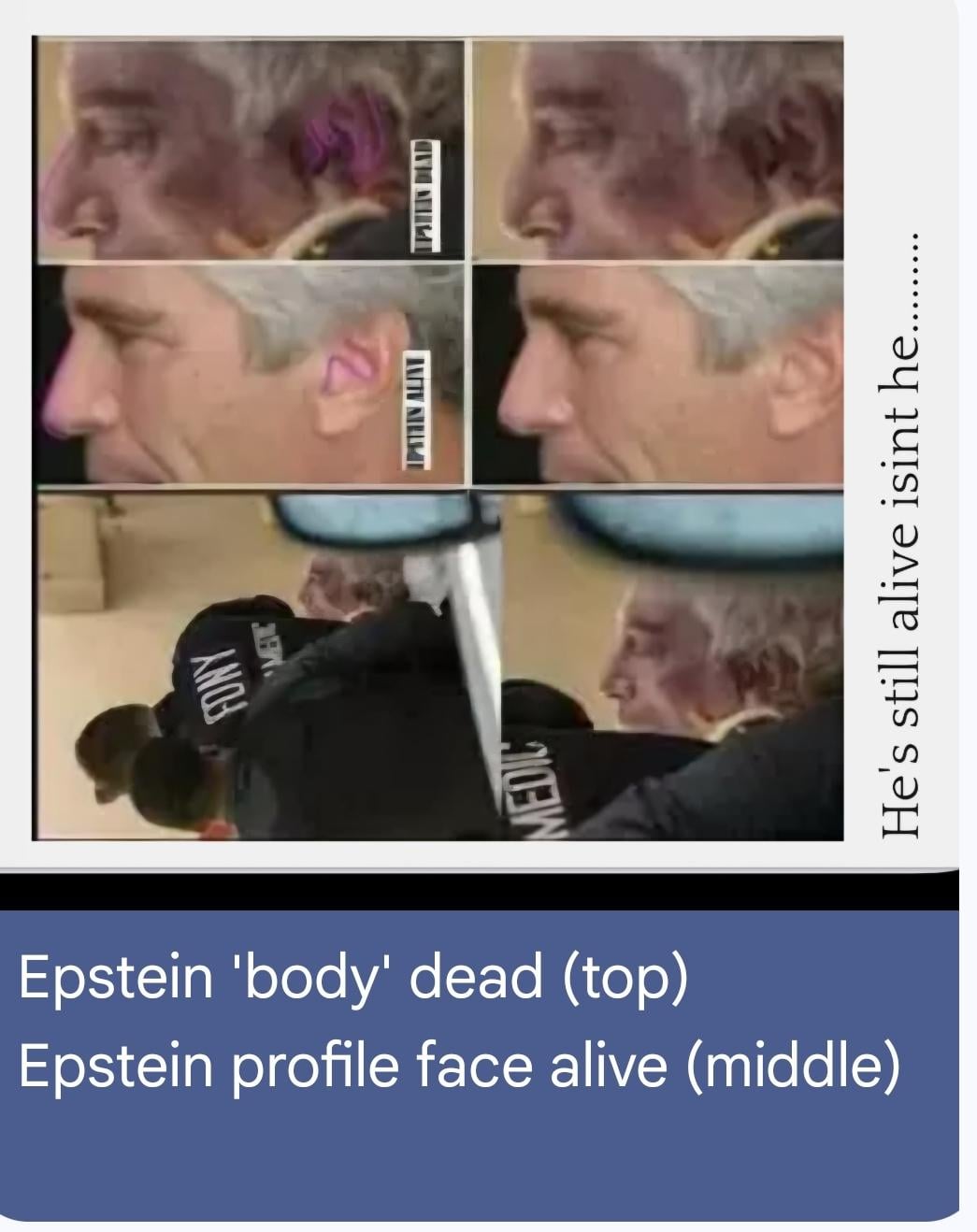 I agree Epstein is probably alive, but please don’t show pictures of what is potentially a dead body without the proper tag on your post. They look different, and cause a very different emotional response in the viewer than when looking at pictures of a clearly alive person.