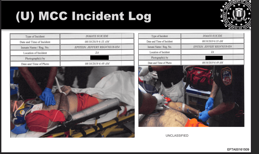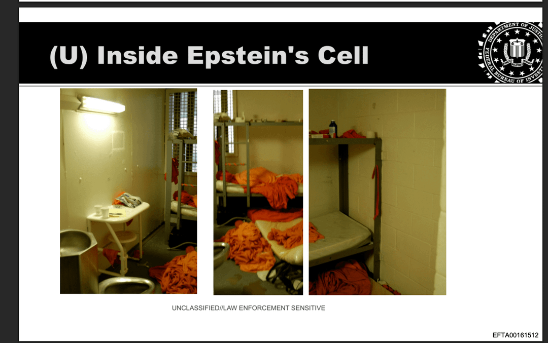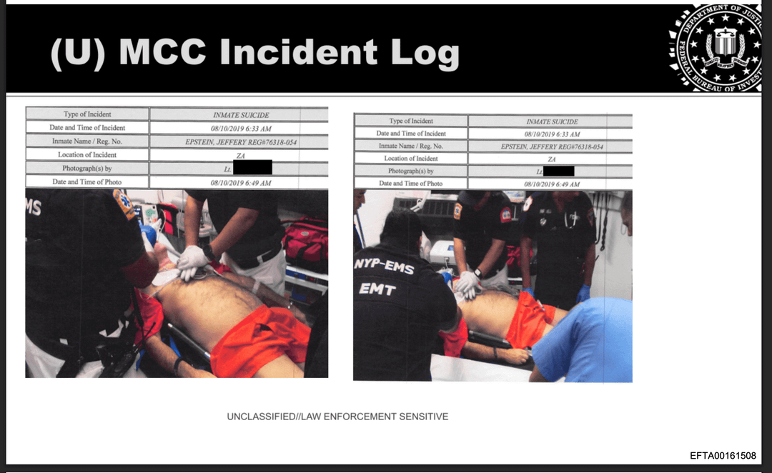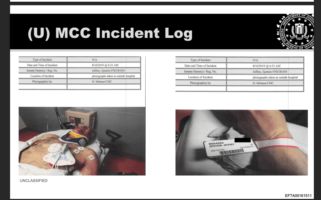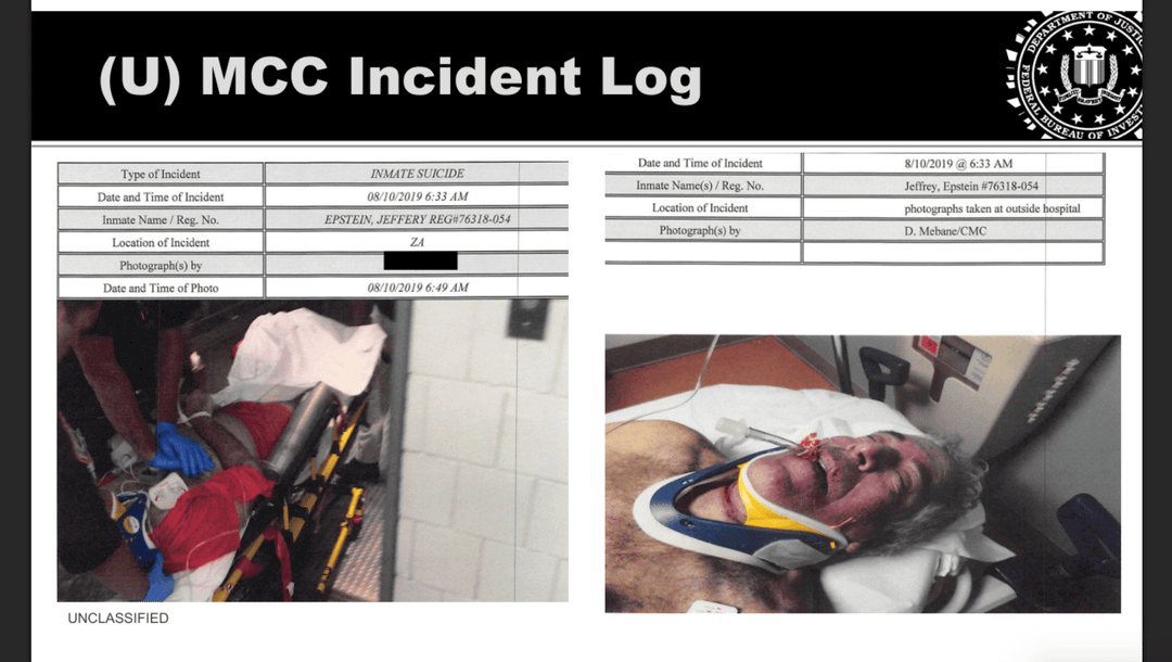 In the FBI interview with Epstein’s brother he made some good points. The ligature marks for a suicide hanging would be up under the jawbone going to the ears. In the images it is straight back like a garrote.