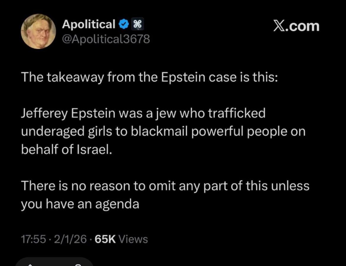 MazdaProphet on February 3, 2026 3:03 pm SS These emails are wild For those who still want to pretend Epstein wasn’t an intelligence asset, Mike Benz brings the receipts. https://m.youtube.com/watch?v=gzdZp11SQMo Legitimate criticism of Israeli behavior is not antisemitism.