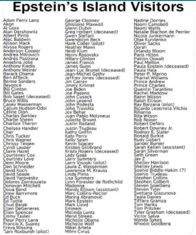 So this is a list someone made up years ago before we had millions of files of actual evidence to go through? And it seems to list every prominent Democrat or left-leaning celebrity but leaves out people like Steve Bannon and Howard Lutnick who undoubtedly visited the island. And you’re posting it now… why?
