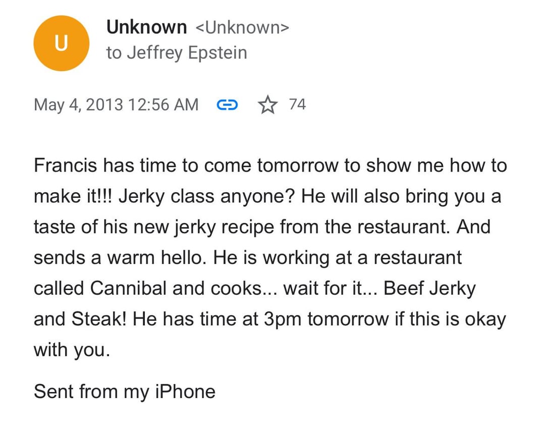 The restaurant “The Cannibal” mentioned in the Epstein Emails, states right in front of our faces that the jerky is made from human meat.