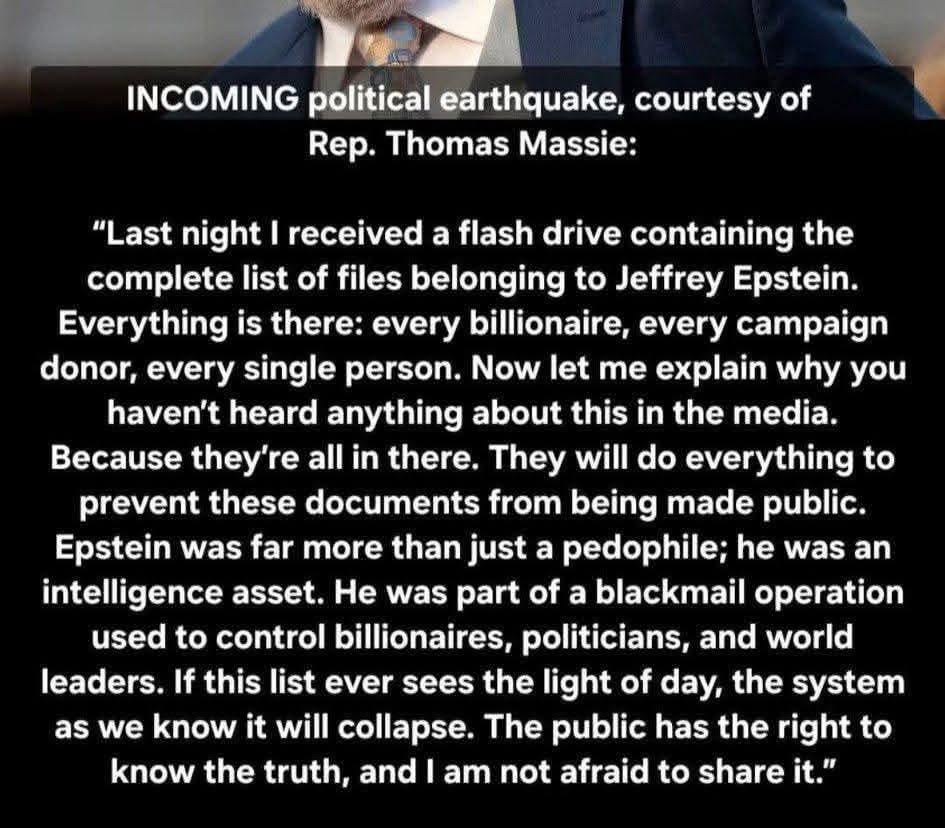 If Representative Thomas Massie actually said this, how long til he winds up suicided? I know he said he wants to read the names of the perpetrators who are currently redacted on the House floor. Posted by barnabybear7