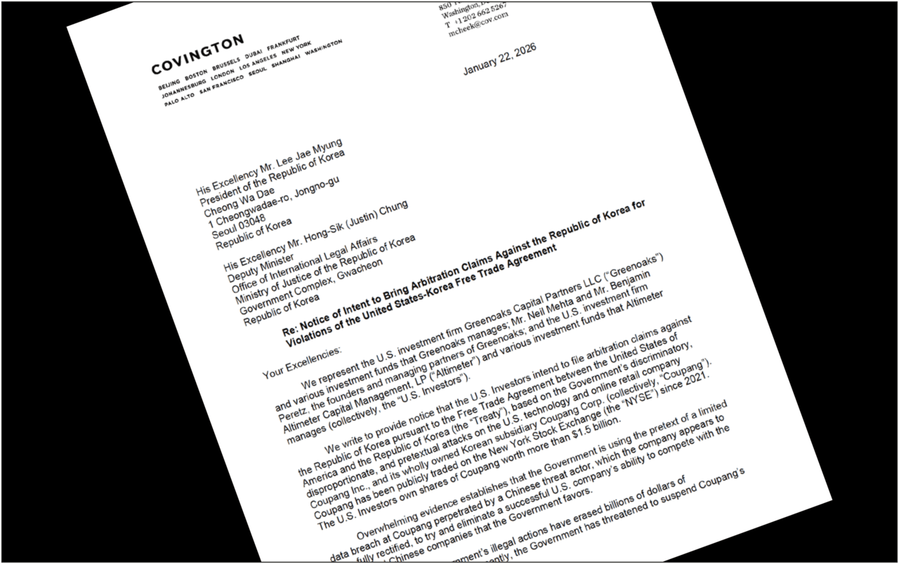 Following a massive personal data breach at Coupang Korea, the South Korean government launched intensive investigations spanning data protection, taxation, and fair-trade compliance. The parties that sent the notice of intent—Greenoaks and Altimeter—are investment firms and shareholders of Coupang Inc. They claim that government investigations caused Coupang Inc.’s stock price to fall by roughly 30% compared to late last year, inflicting enormous investment losses. Their demand is simple: South Korea should pay for those losses.