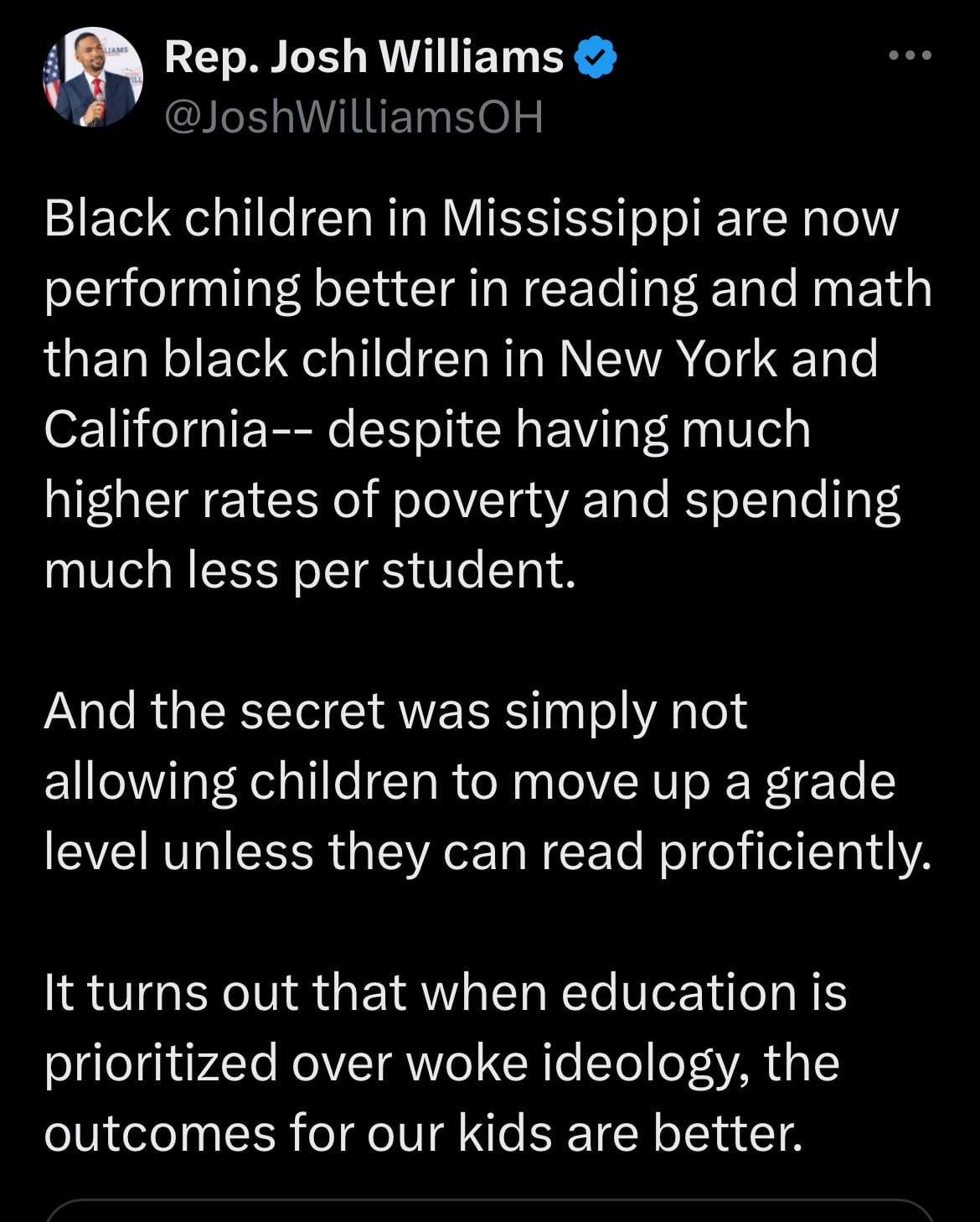 Now of course, you COULD use words like “PANDERING” and post a twitter screenshot of a person trying very very hard to make it a left vs right issue, but holding children back is only a small small piece of the overall improvement, as the rest of their plan and goals (see: using evidence-based teaching methods and phonics-first language learning in addition to focusing ONLY on learning literacy in the first few years) has actually done a lot more than holding students back.