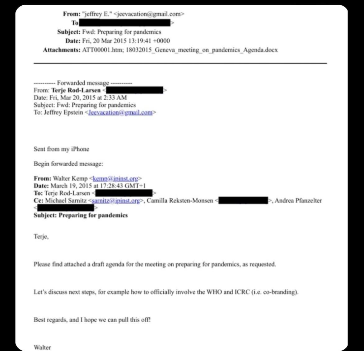 An email to Jeffrey Epstein from Walter Kemp back in 2015. (“Preparing for Pandemics”, “Let’s discuss next steps, for example how to officially involve the WHO and CDC”, “And I hope we can pull this off”)