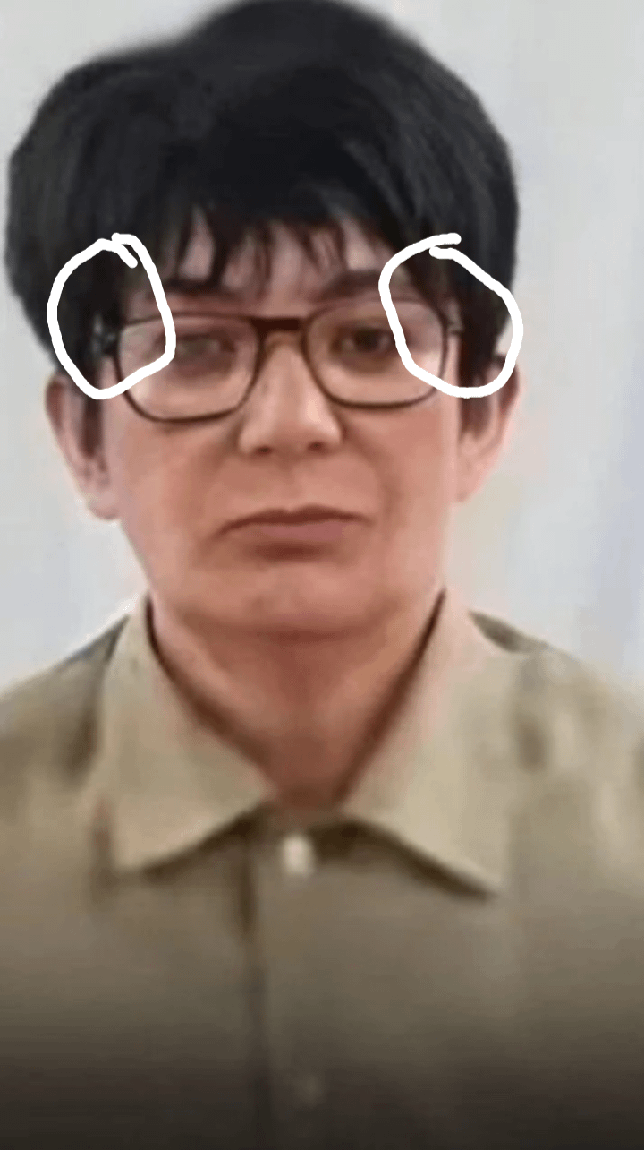 Zoom in the top of her glasses frame, you will see a completely different shaped right side lense frame on the top when compared to the left