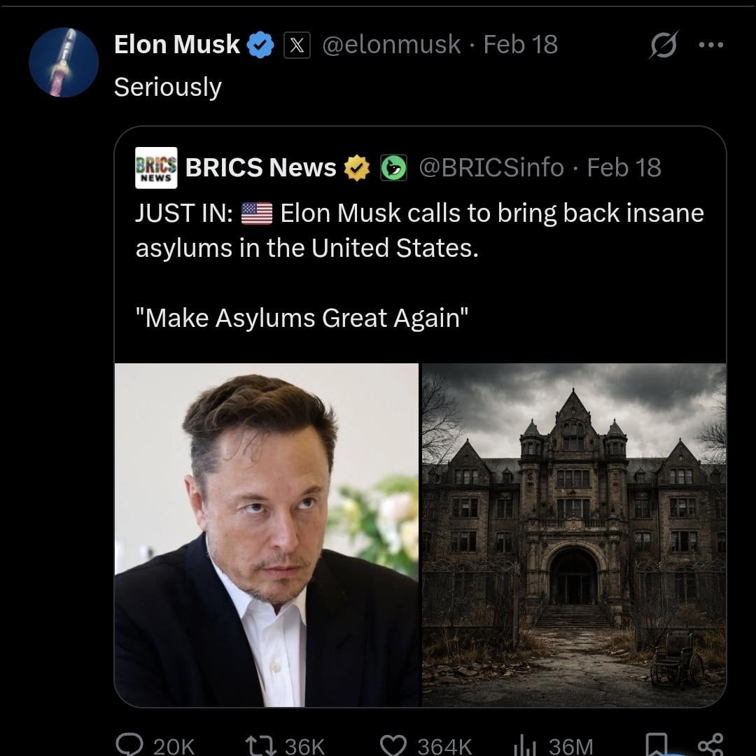 Just like the previous reset from around the very early 1800's, where dissidents from the old world were taken to be silenced under the guise of being "insane" to keep them from voicing truths about the third industrial complex to the new population of Western societies. Fast forward a few decades to the World's Fair incubator babies, cabbage patch kids or the orphan train children aka the modern day NPC who has zero internal dialogue. This subbreddit is loaded with them reacting to the most benign and vanilla stories pushed forth by the MSM to keep the bread and circus wheel turning. What Elon is suggesting here is to silence truth absolutists who warn about the rise of the fourth industrial complex, AI and the technocratic enslavement of humanity. His grandfather was a pioneer in this and Elons role has been a well organised plan to put him were he is today. Once you realise your entire existence has been a well thought out lie, you'll understand history repeats…