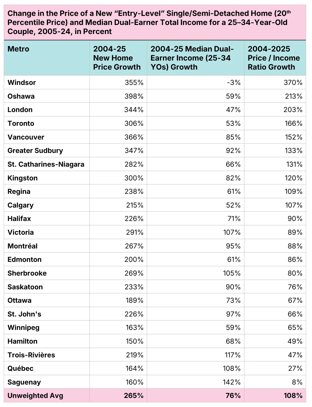 - Starter homes have detached from middle-class incomes: Across 23 Canadian metros, newly built family-sized starter homes are now over twice as expensive relative to income as they were in 2004.