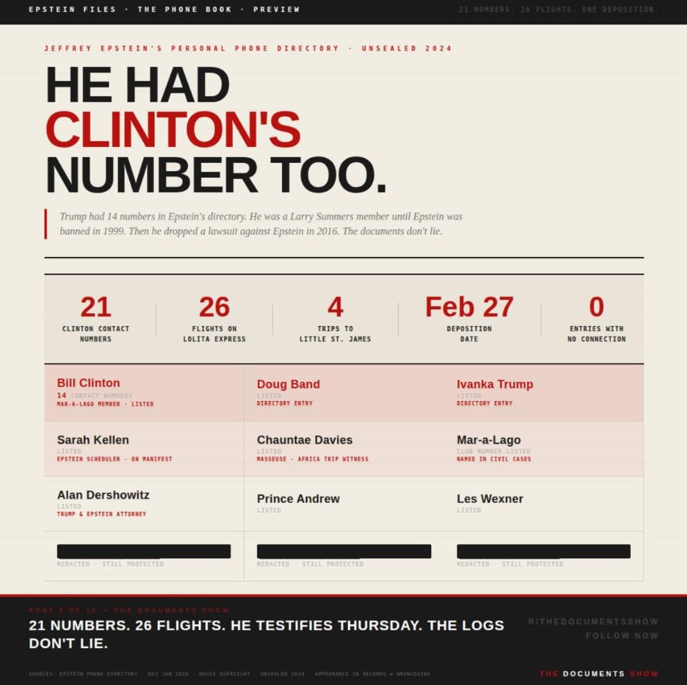 Bill Clinton has 21 entries in Epstein’s private phone directory. He flew on Epstein’s plane 26 times. He testifies Thursday Feb 27 under oath about his relationship with a convicted sex trafficker.