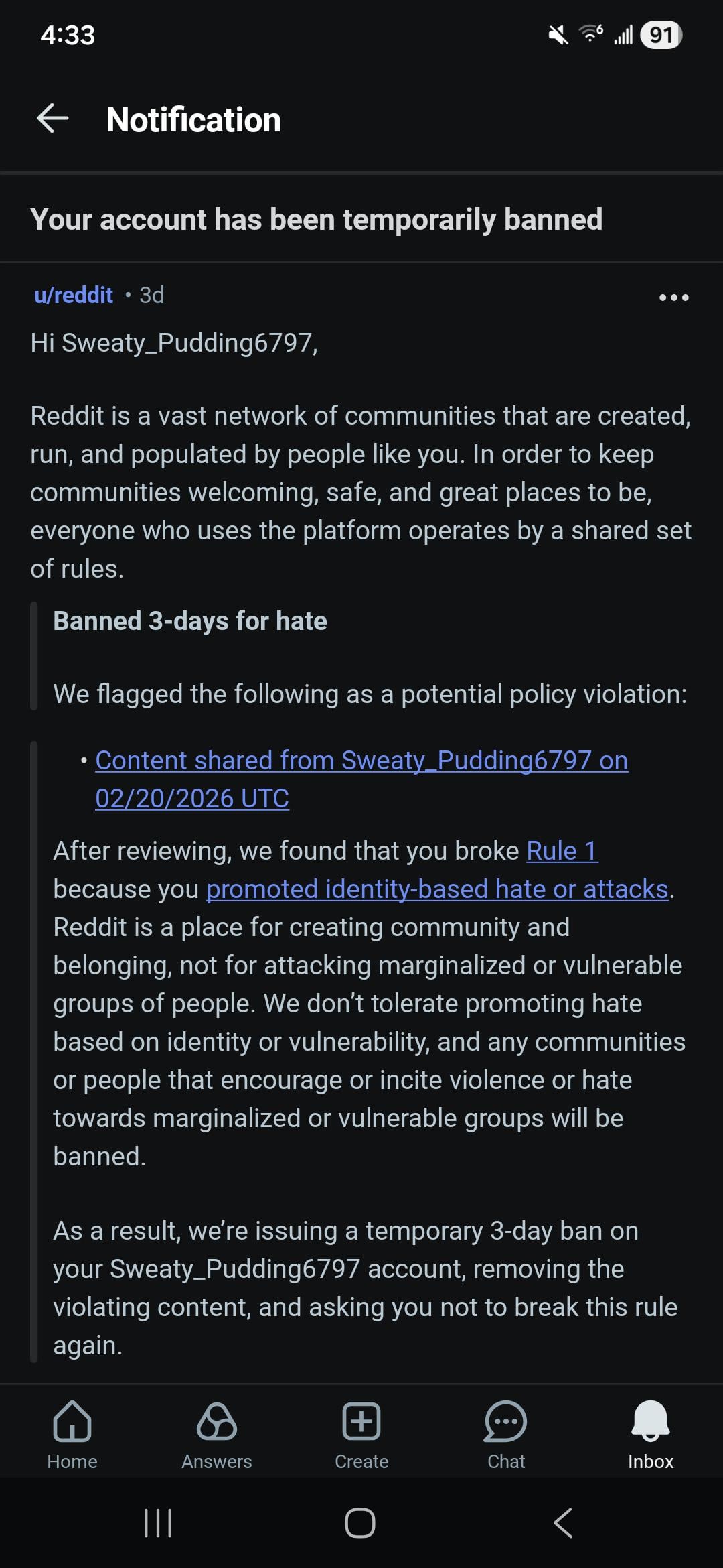 6. I bet it was something other than that comment, but even if what you’re saying is true it doesn’t make you a victim of censorship. There’s nothing to be outraged or offended over. Reddit is literally a 4th tier garbage social media platform that cares more about bots than real users. People that are truly censored don’t get to use any social media once they’re kicked out and certainly aren’t allowed back after only a few days.