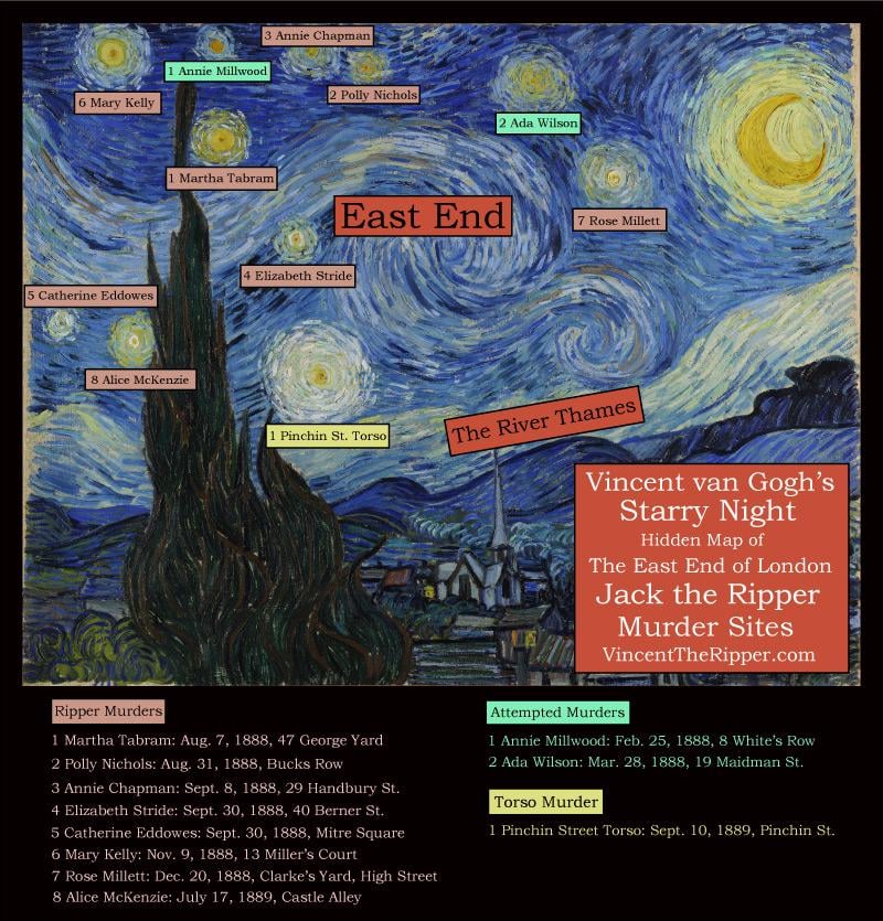 I’m Dale Larner, author of VINCENT THE RIPPER, a serious non-fiction book presenting the evidence Vincent van Gogh was Jack the Ripper. The Starry Night map is just one of the many pieces of evidence I present. Please excuse the self-promotion. I’ve uncovered the hidden truth about Van Gogh and the world needs to know Vincent’s real nature. Here’s the book website to see more about the Starry Night map and much more: [https://VincentTheRipper.com](https://VincentTheRipper.com) Thanks!