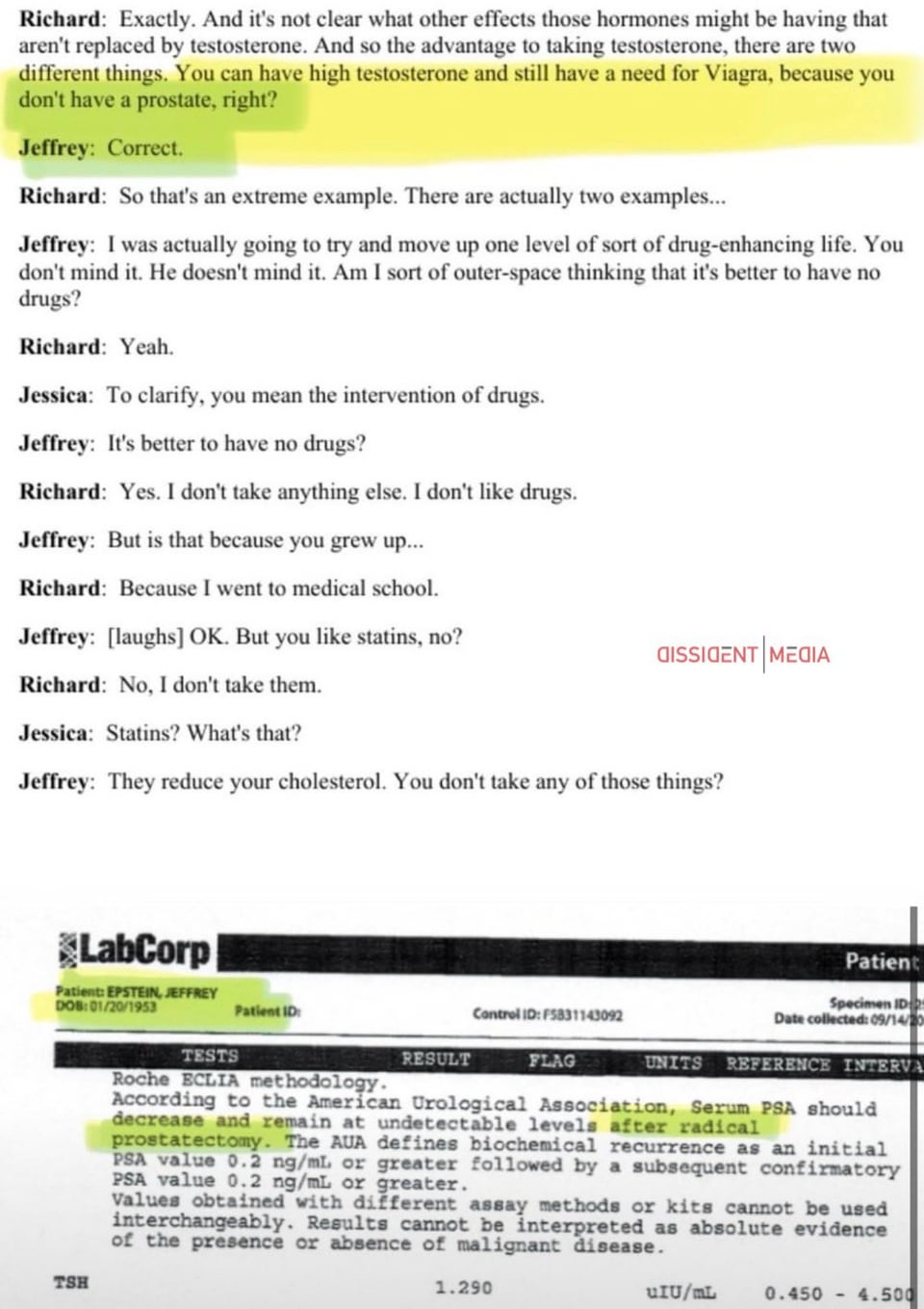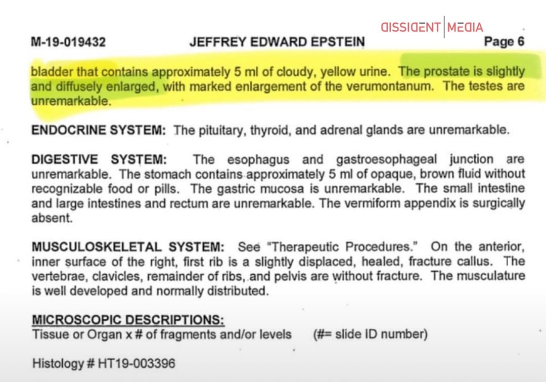 The medical examiner who studied Epstein’s corpse noted an enlarged prostate, but Epstein’s own words and medical records in the released files seem to indicate his prostate was removed. EFTA02853705 EFTA00432804 EFTA00314056