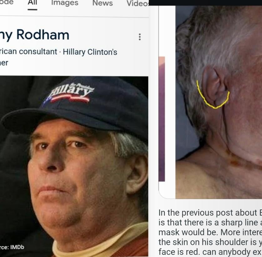 As anyone who is detached from the matrix can see, the body they use for Epsteins prison suicide has the same ear as Tony Rodham not Epstein's. As awaken individuals know, Tony Rodham died 2 month before Epsteins prison "suicide". With the stuff in the files about putting bodies on ice, which player characters know, its easy to conclude in your freed mind that the stored Tony after his death and used his body. With the alteres cell cctv footage, this, the publix spottings of him and maxwell. Everything points to Epstein's Not Dead