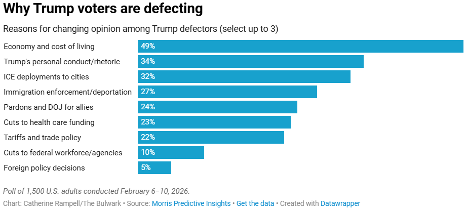 Affordability is the issue for the 2026 midterms. In virtually every poll, with virtually every demographic, some version of “inflation/prices/cost of living/economic problems” tops the list of the most important challenges facing the country. It also tops the list of reasons Trump’s own voters are ditching him, according to polling from Morris Predictive Insights.