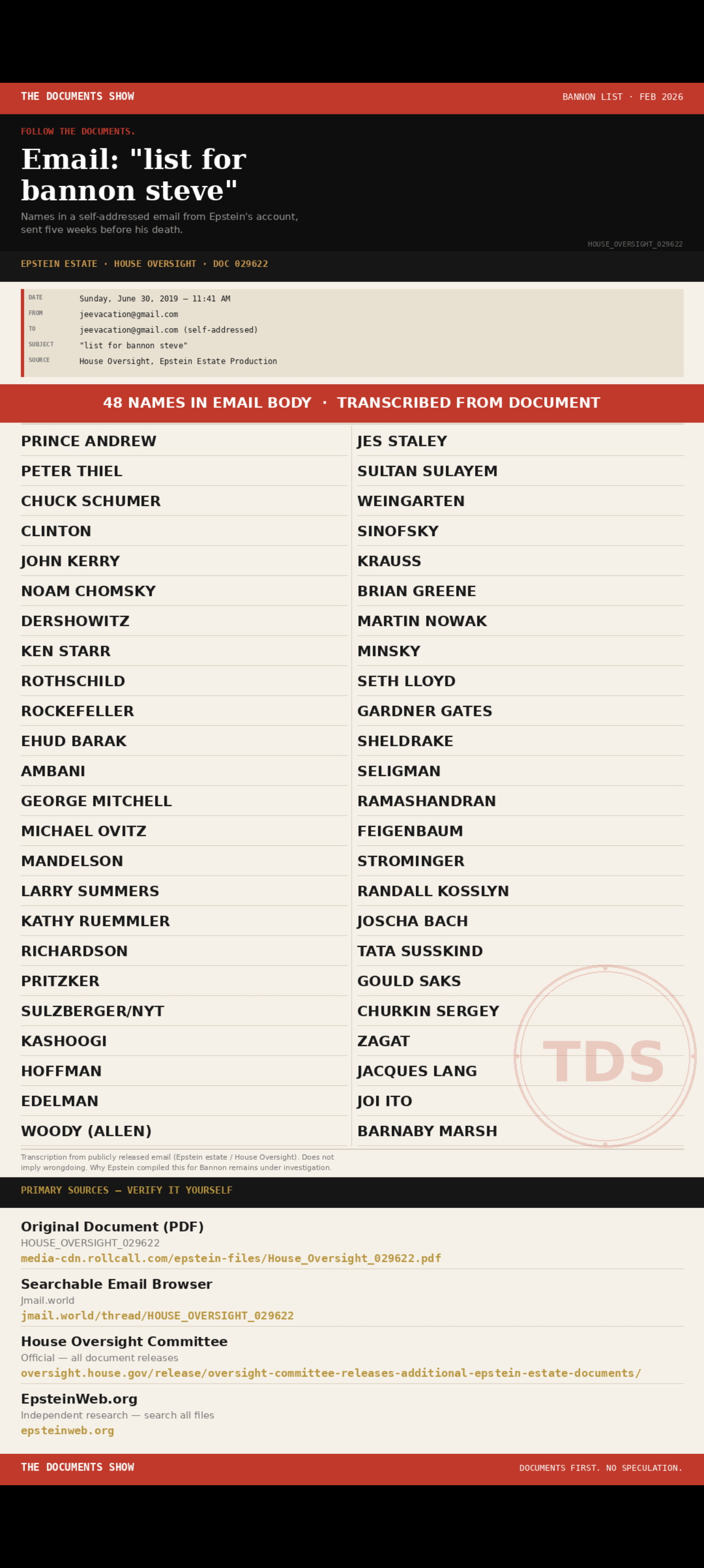 48 names. One email. Five weeks before Epstein died, he compiled a list for Steve Bannon. Prince Andrew, Peter Thiel, Clinton, Rothschild, Rockefeller, Larry Summers, Woody Allen — all on it. Original document sourced. [HOUSE_OVERSIGHT_029622]