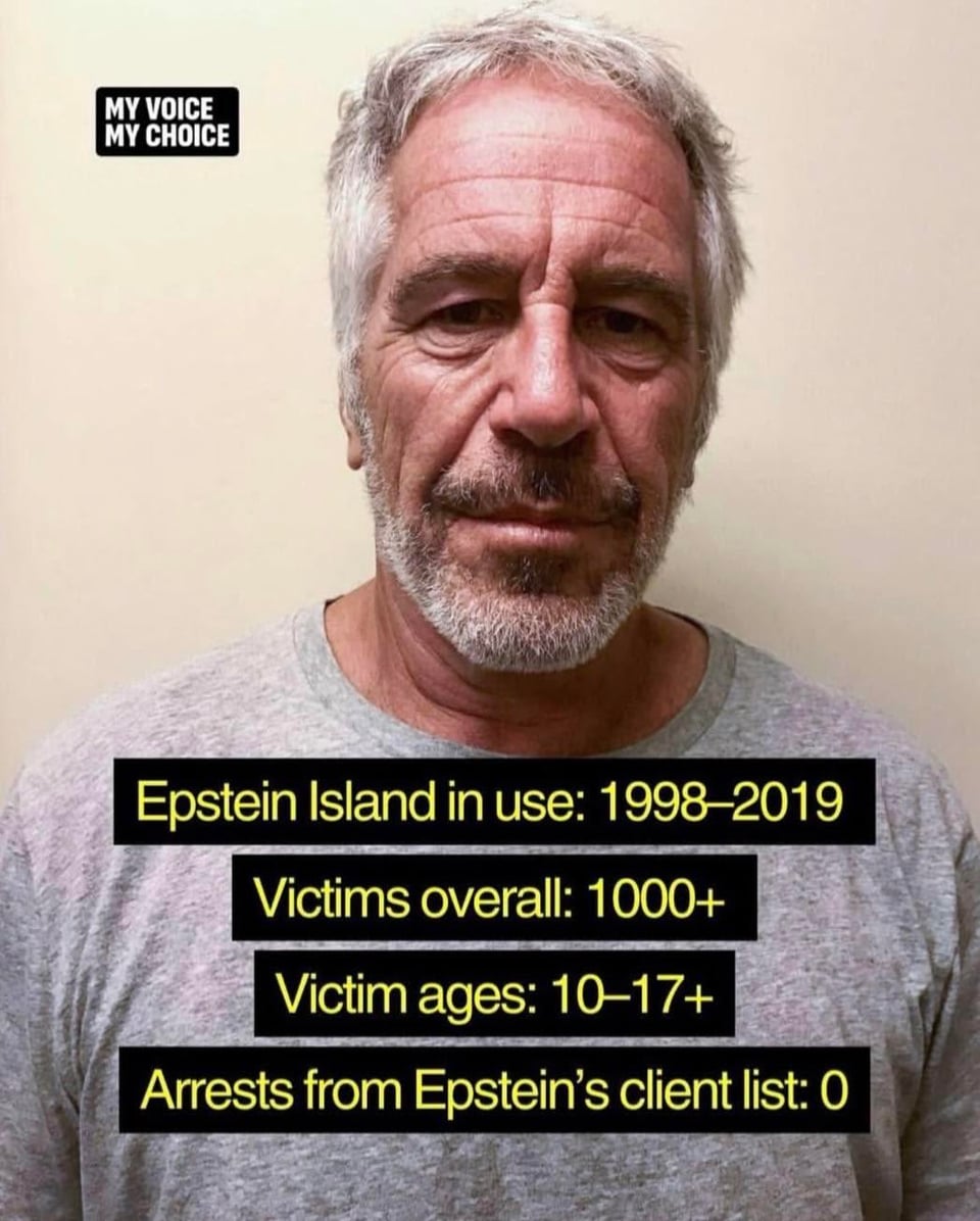 Epstein Island ran for 21 years. 1000+ victims aged 10-17+!!!! ZERO arrests! Survivors say they haven’t even been contacted by the Dept. of [in]Justice. Isn’t it time for people to start planning a ‘divorce’ from this CYST-Um. Society is married to monsters that wont change!