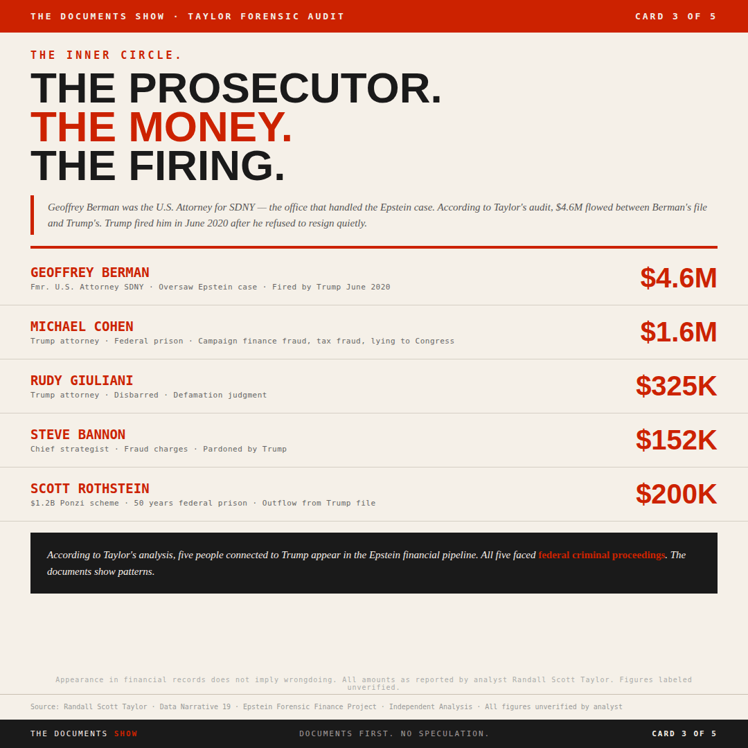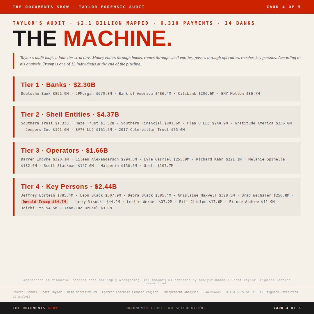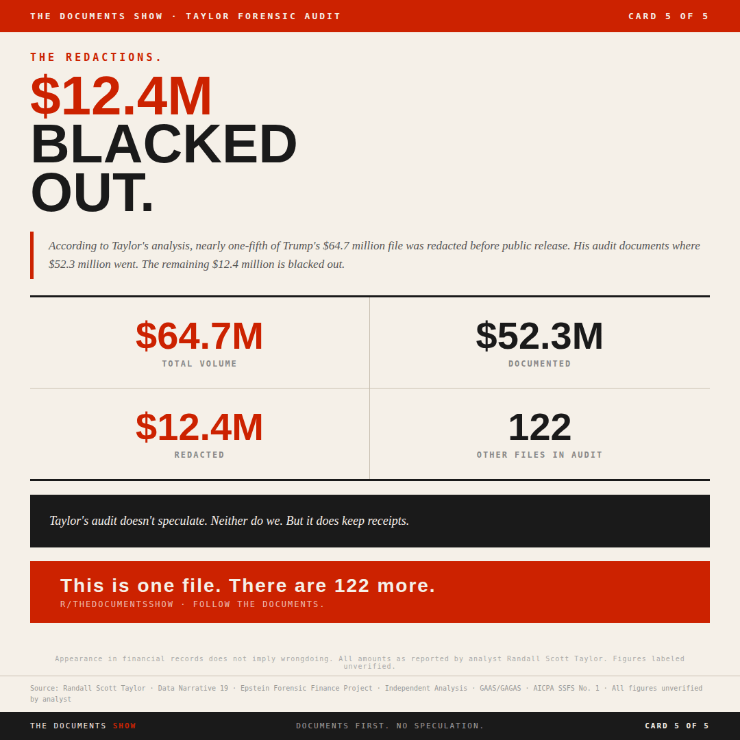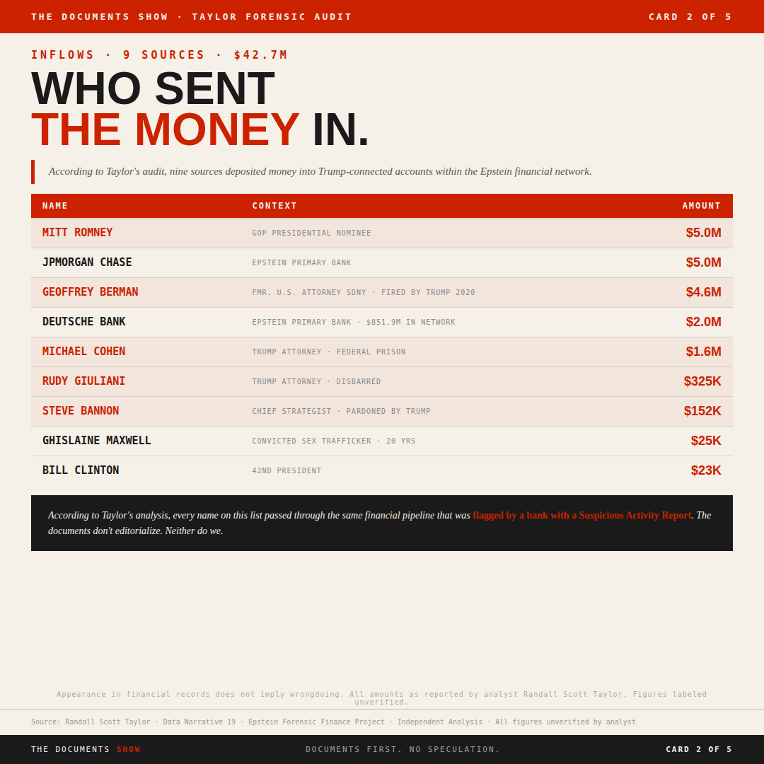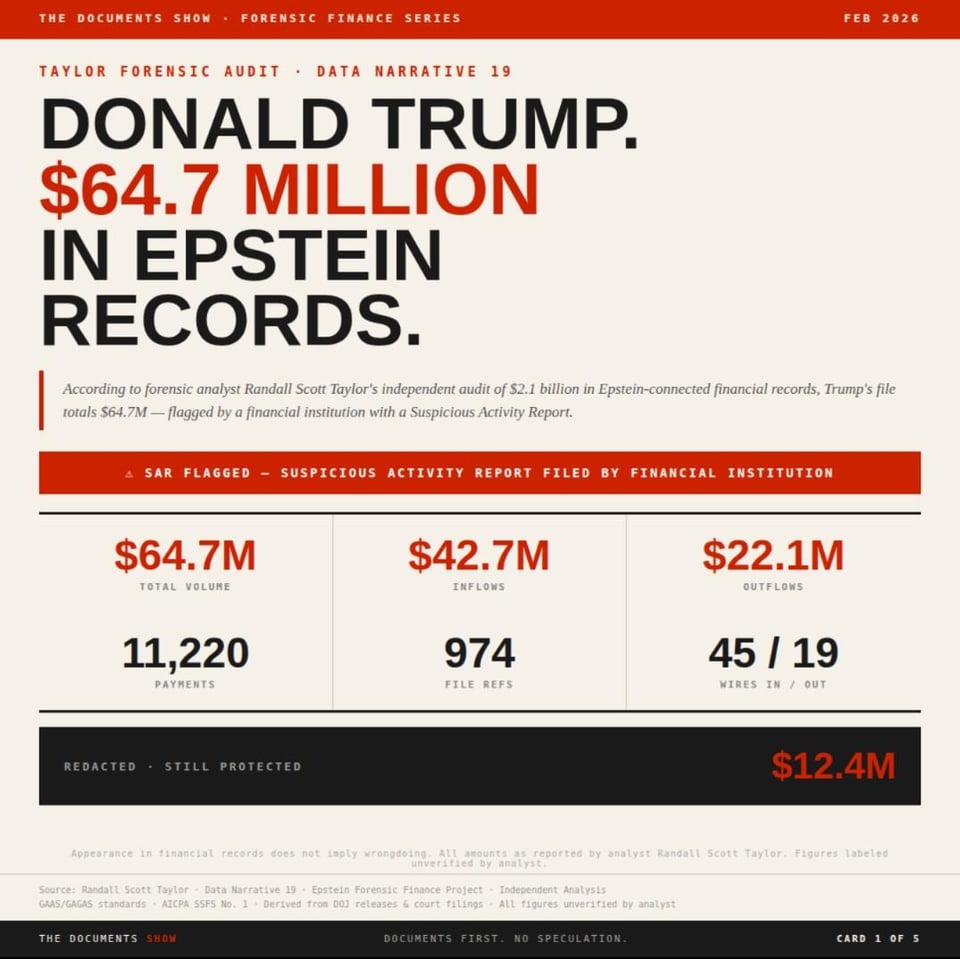 Forensic auditor Randall Scott Taylor analyzed $2.1B in Epstein financial records. His findings on Trump: $64.7M in documented volume. SAR flagged. Here’s the data. [TDS Forensic Finance Series]