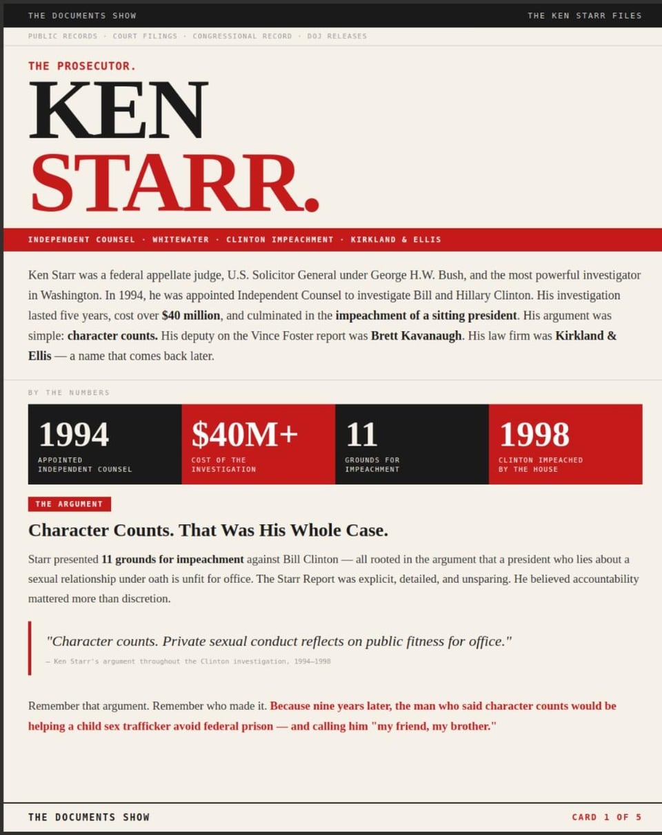 He spent $40 million investigating a president for lying about sex. Then he helped a child sex trafficker avoid federal prison. Called him “my friend, my brother” for a decade. The Ken Starr Files.”