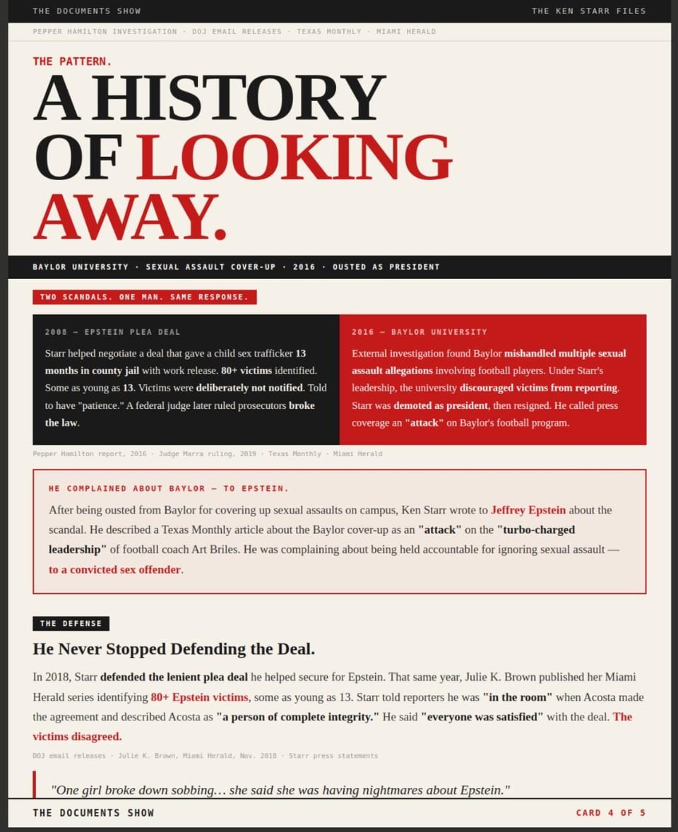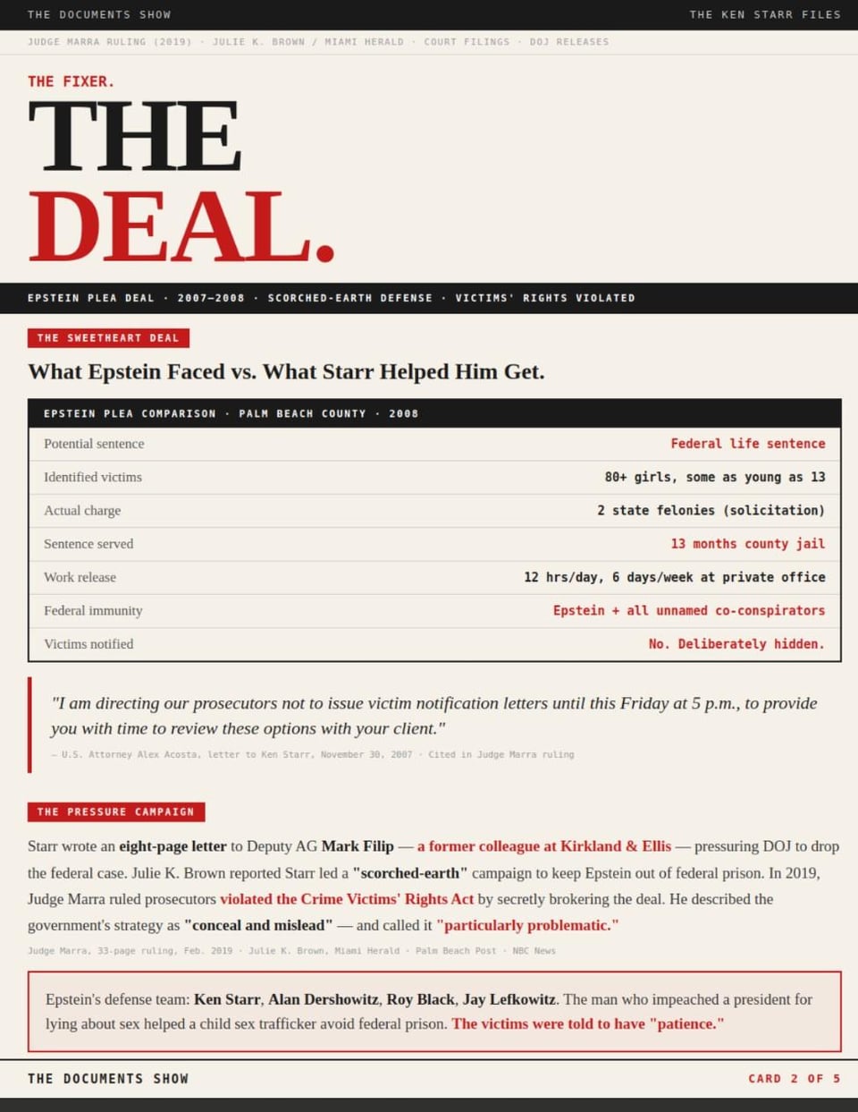 In 2007, Starr joined Jeffrey Epstein’s defense team. By 2008, he had helped negotiate what a federal judge would later call a deal built on a strategy to “conceal and mislead”. 13 months in county jail with work release for a man facing a potential federal life sentence, with 80+ identified victims, some as young as 13. The victims were deliberately not notified. A federal judge ruled in 2019 that prosecutors violated the Crime Victims’ Rights Act (Judge Kenneth Marra, 33-page ruling, Feb. 2019).