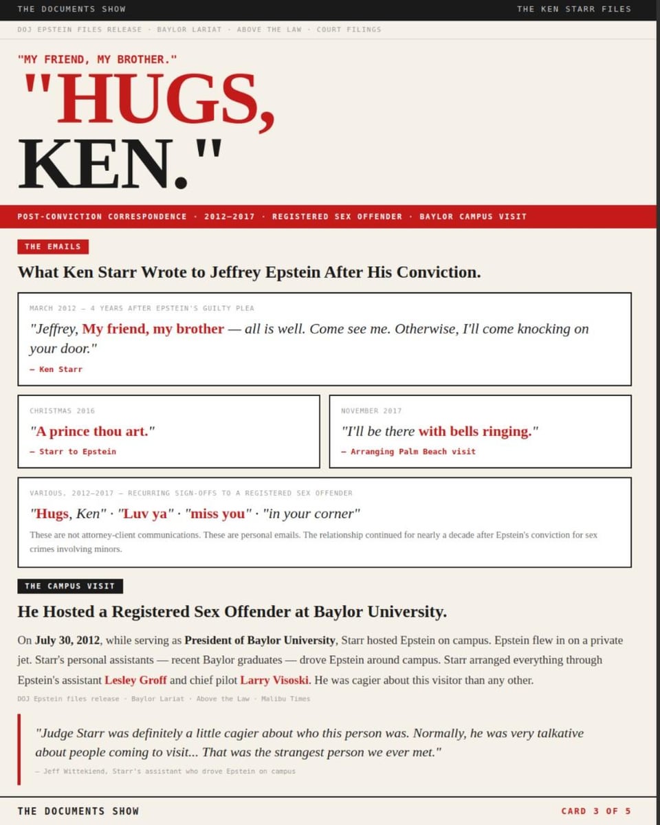 But Starr didn’t just represent Epstein. He kept writing to him, for years. “My friend, my brother” (March 2012). “A prince thou art” (Christmas 2016). “Hugs, Ken.” “Luv ya.” “Miss you.” These aren’t attorney-client communications. These are personal emails to a registered sex offender, exposed in the DOJ Epstein files release.