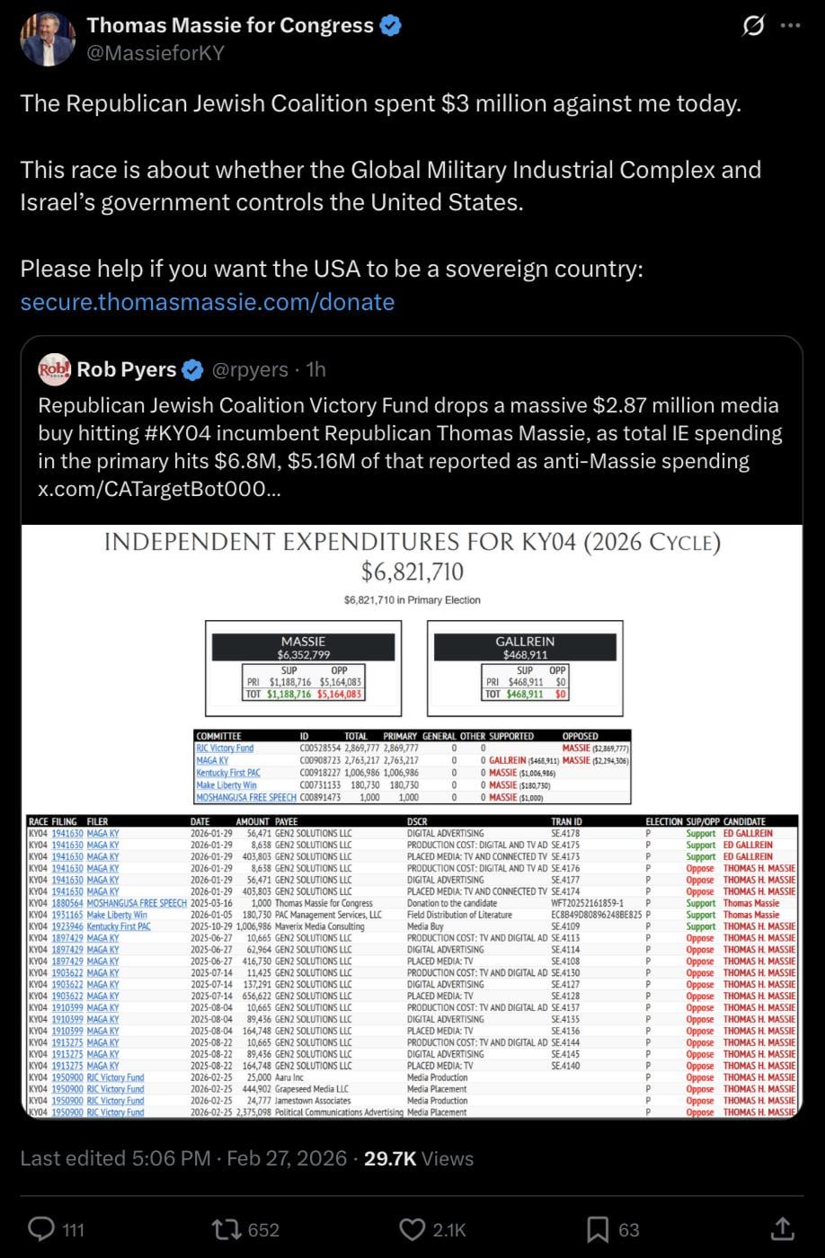 * anti-Massie campaign is funded by a trio of billionaires **Paul Singer John Paulson**, and **Miriam Adelson** who have contributed to the **”MAGA KY” super PAC.**