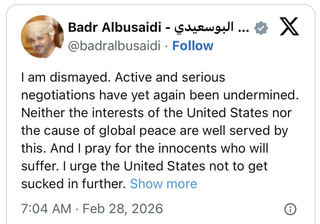 Omani Foreign Minister who was mediating negotiations between U.S. and Iran urges the U.S. not to get involved Posted by DumbNeurosurgeon