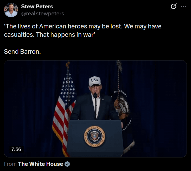 SS: Warmongers love the idea of sending you or your kids to die in a war, but never their own. As predicted, there is more escalation happening in the Middle East by the “Board of Peace”. That’s straight out of 1984, “War is Peace”.
