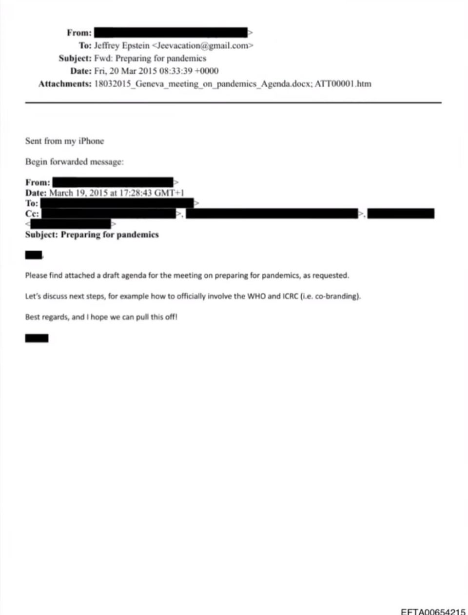 In March 2015 Epstein received an email with most of it blacked out in released files. The visible part reads “Please find attached a draft agenda for the meeting on preparing for pandemics. Let’s discuss next steps, for example how to officially involve the WHO and ICRC — co-branding.”