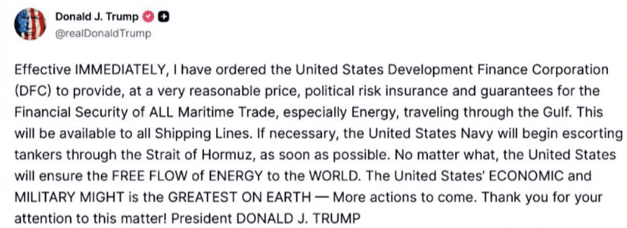 SuS: Trump tries to calm the world that oil through Hormuz will flow. He promises the US DFC will insure ships, and escort them though Hormuz with the USN “if necessary” and “as soon as possible”.