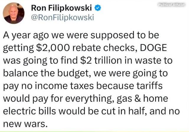 Yes a politician lied again, in other news water is wet. Every single person who gets elected as president usually doesn’t follow through on the majority of their promises, unfortunately. I have no illusions about Trump or any of the rest of them. If Kamala got elected it would have been bad in a different way more like the UK and Canada. Not denying that Trump’s presidency is an absolute shit show but I think at this point the whole world is fucked. It’s too corrupt I don’t even know where we can go from here.