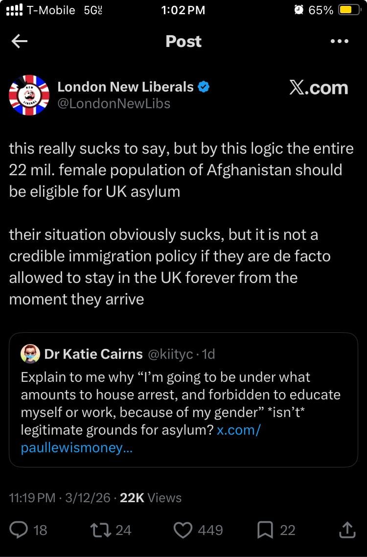 > the entire 22 mil. female population of Afganistan should be eligible for UK asylum