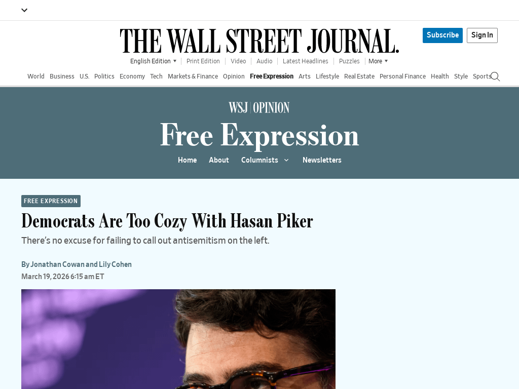 > Mr. Piker is anti-American, antiwomen, anti-Western and antisemitic. No Democrat should engage with him. All should seek to push him to the fringe, where he belongs.