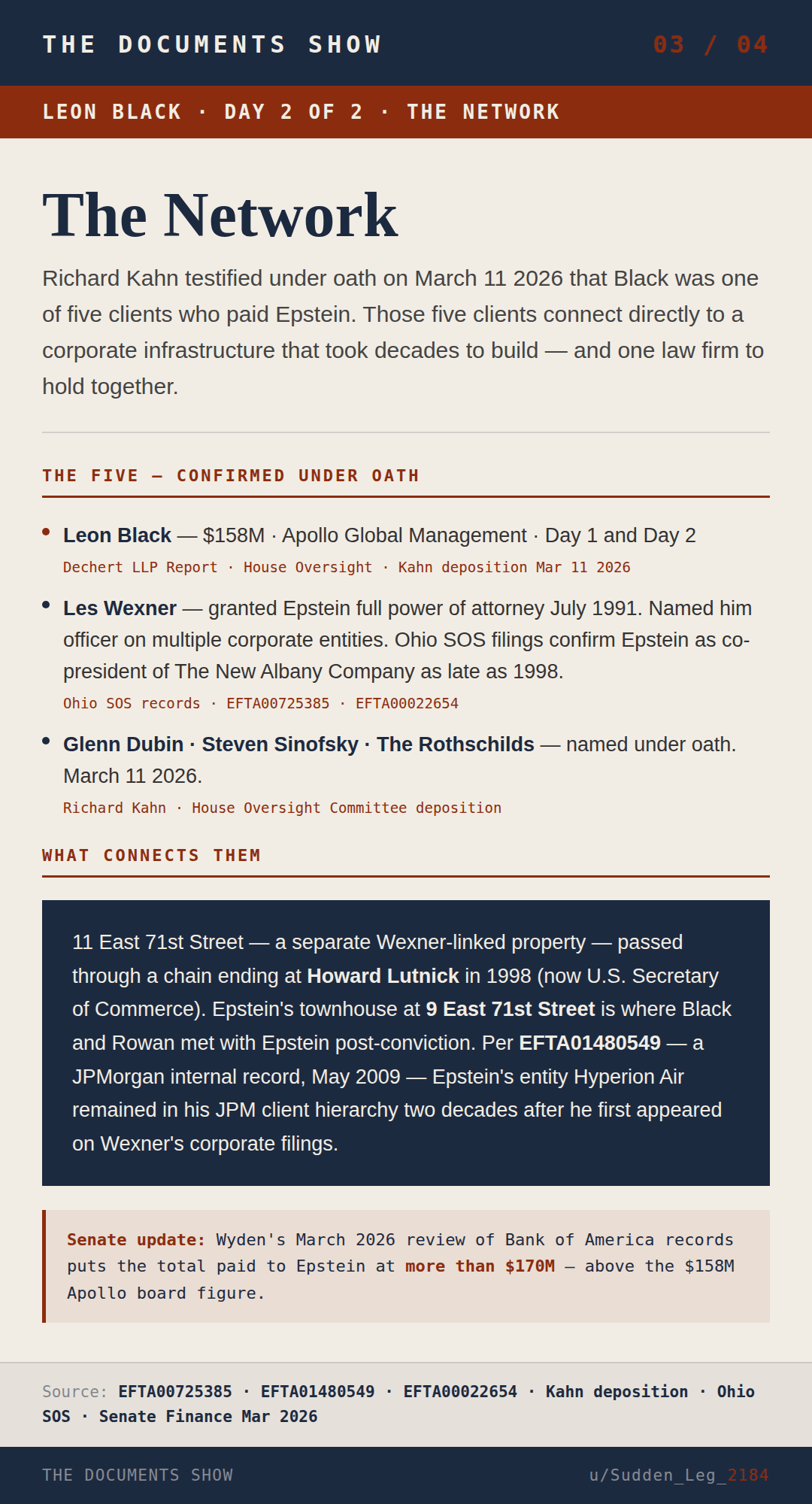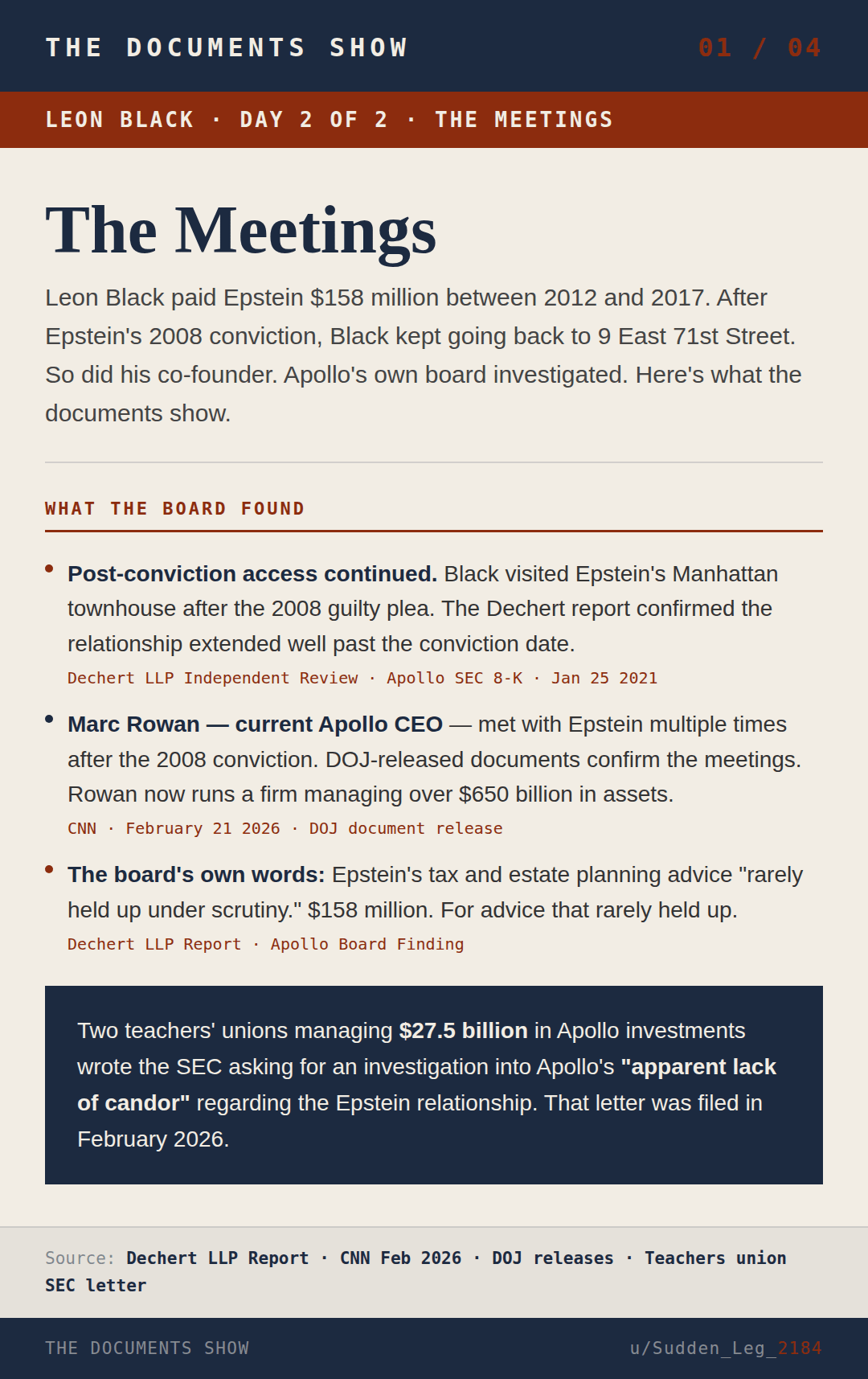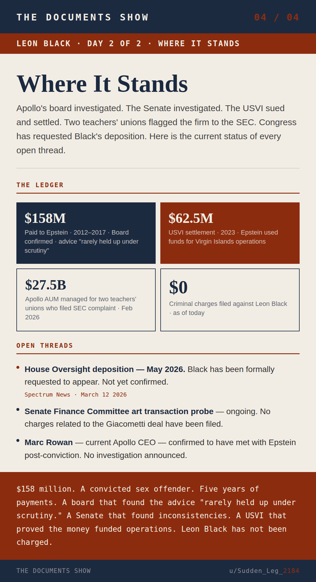 Day 1 covered the number. $158 million paid to a convicted sex offender between 2012 and 2017. Apollo’s own board confirmed it.