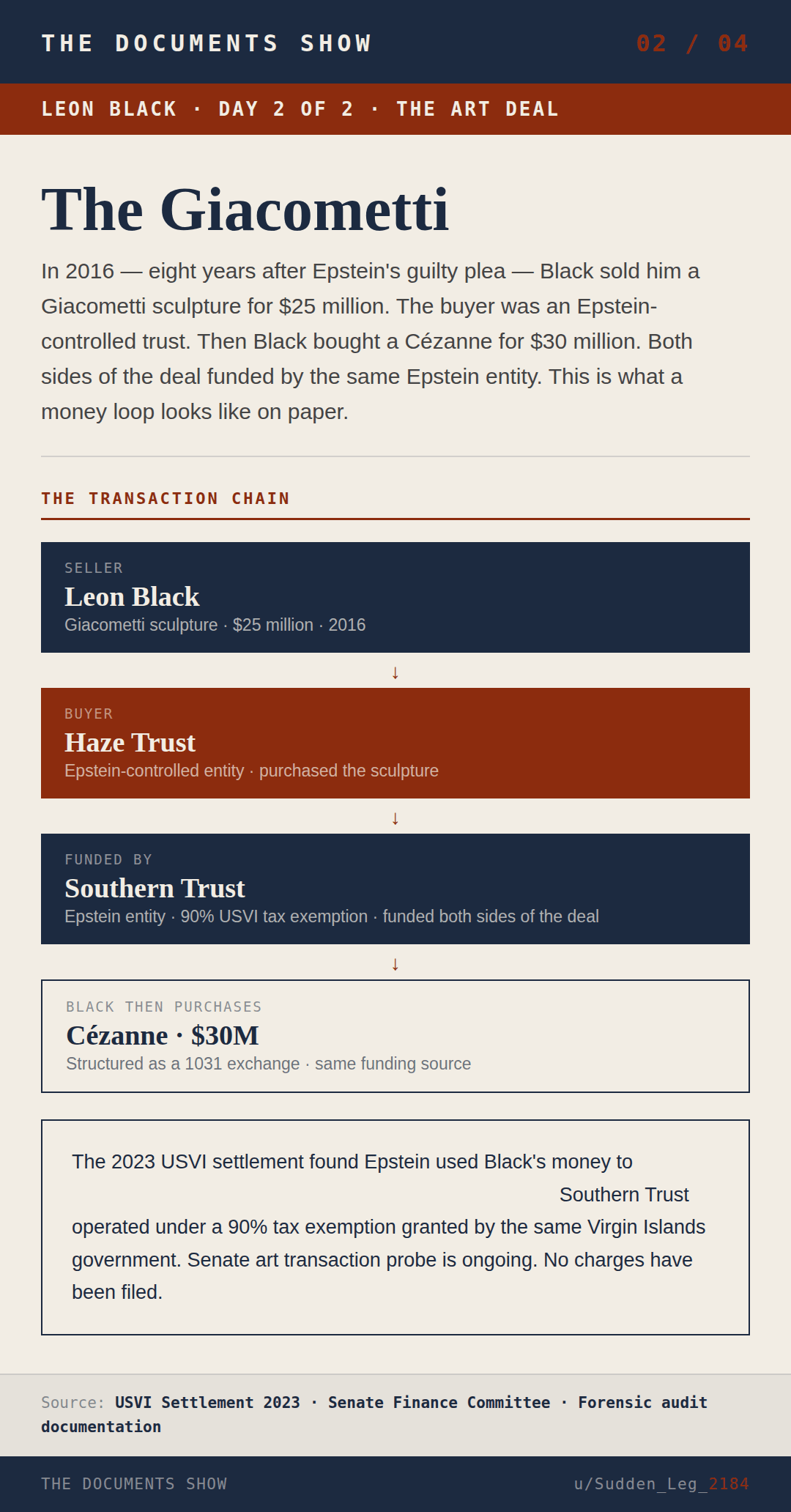 In 2016, eight years after the guilty plea, Black sold Epstein a Giacometti sculpture for $25 million through an Epstein-controlled trust called Haze Trust. He then purchased a Cézanne for $30 million structured as a 1031 exchange. Both sides of the transaction were funded by Southern Trust, an Epstein entity operating under a 90% tax exemption granted by the US Virgin Islands government. The 2023 USVI settlement found Epstein used Black’s money to “partially fund his operations in the Virgin Islands.”