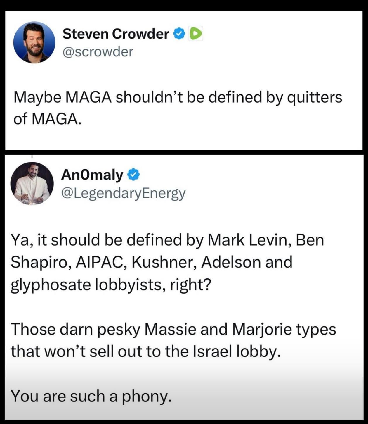 Don’t be fooled by Maga comedians. They scream ‘somewhere there’s a pile of floating garbage called PuertoRico, let them starve!’ Then immediately say ‘20000000000 for AIPAC again’. They’re controlled opp against CK, joe Kent, Massie, 9/11 Carlson