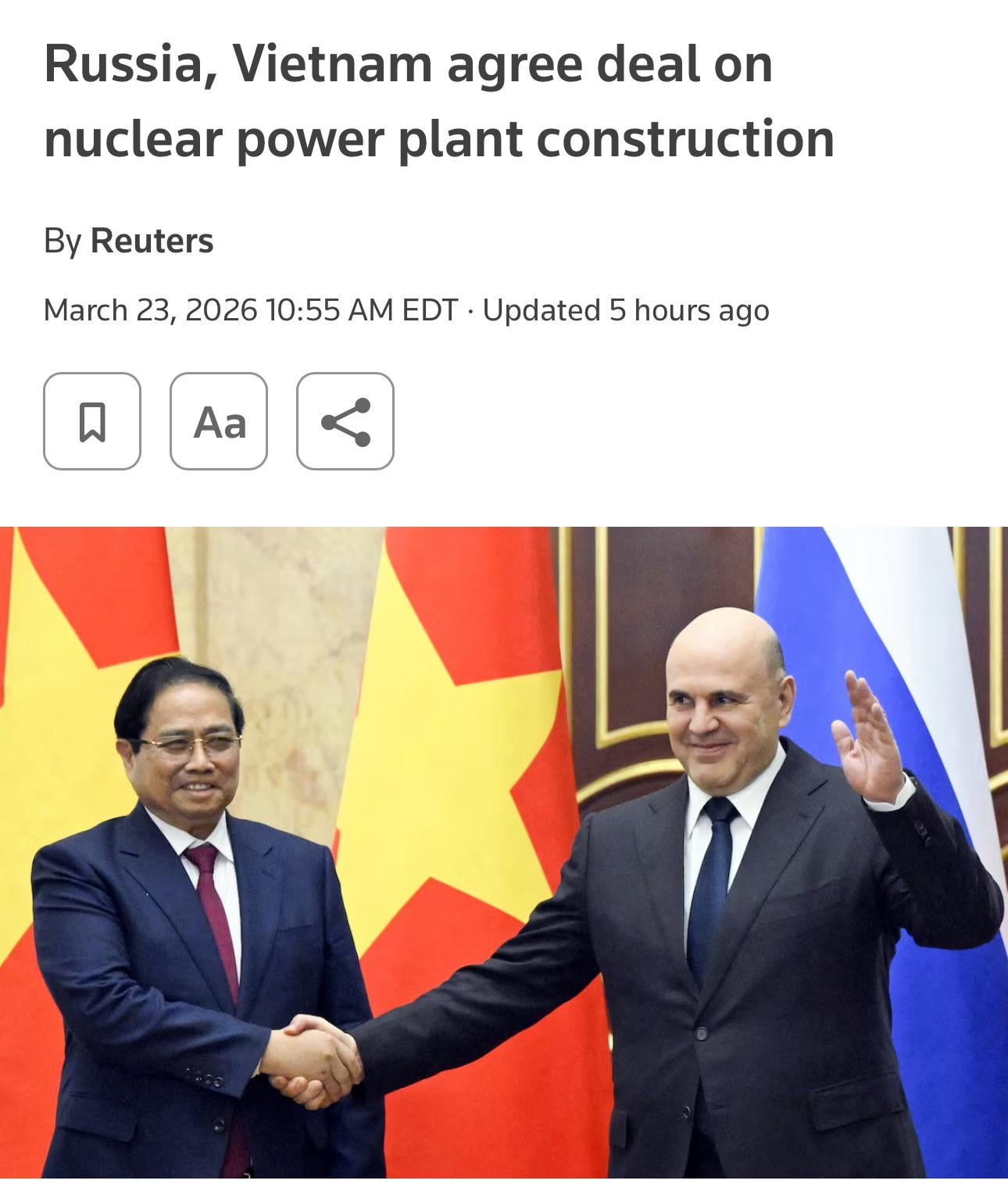 Marcellius-the-3rd on March 23, 2026 8:42 pm Source: https://www.reuters.com/business/energy/russia-vietnam-agree-deal-nuclear-power-plant-construction-2026-03-23/ https://world-nuclear-news.org/articles/vietnam-russia-intergovernmental-agreement-on-new-nuclear