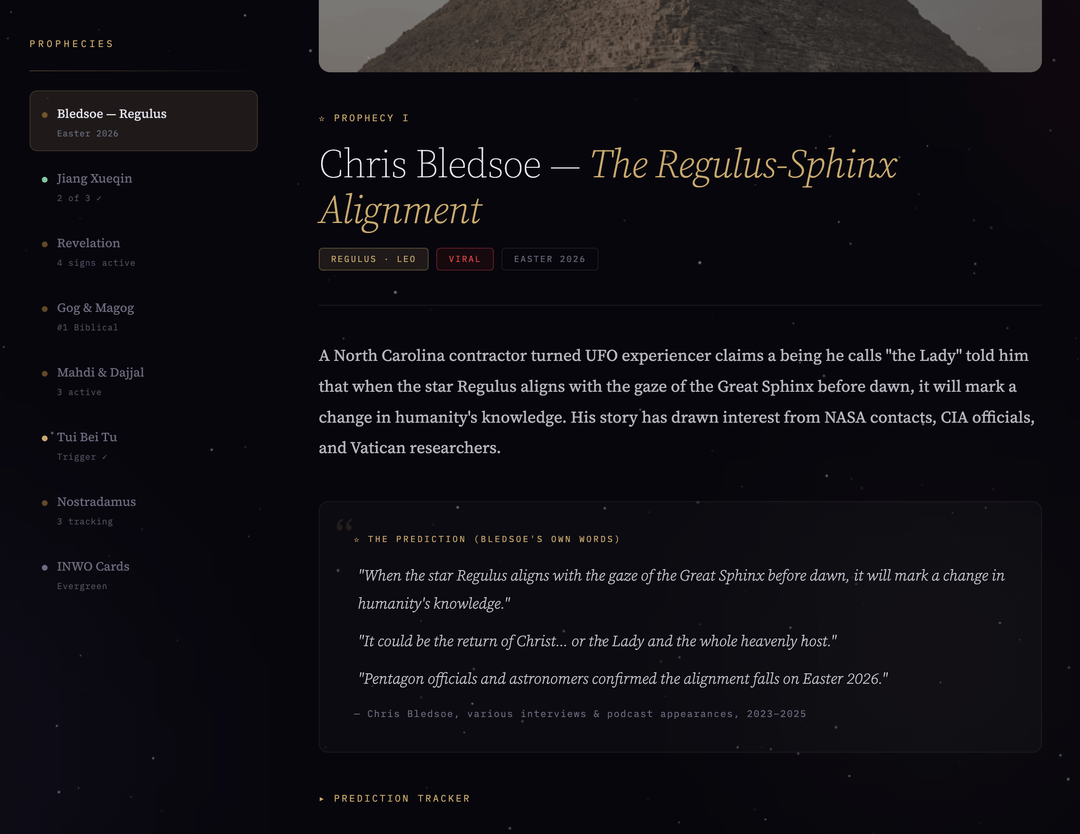 Chris Bledsoe, UFO contactee from North Carolina, claims a being called "the Lady" told him when Regulus aligns with the Sphinx's gaze before dawn it marks "a change in humanity's knowledge." CIA, NASA, Vatican researchers have all looked into his case. The date is supposedly Easter 2026, April 5th. 11 days. Im skeptical, the prophecy is vague and Regulus rises over Cairo every day so the astronomy doesnt really check out. But Easter is already the return of Christ for billions of people, and the war thats happening right now has a lot of religious undertones that are hard to ignore.