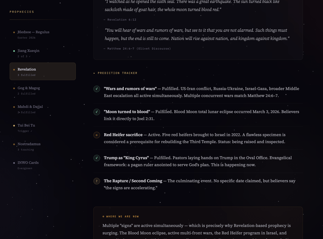 SS: Bledsoe Regulus-Sphinx prophecy dated Easter 2026. All three Abrahamic religions’ end times prophecies stacking up around the Iran war simultaneously. Gog/Magog coalition matching Iran-Russia, blood moon during Ramadan, red heifer and Third Temple movement, Christian Zionist theology in the administration, Islamic hadiths about wars in Iran before the Mahdi. Every side of this conflict believes theyre fulfilling scripture.