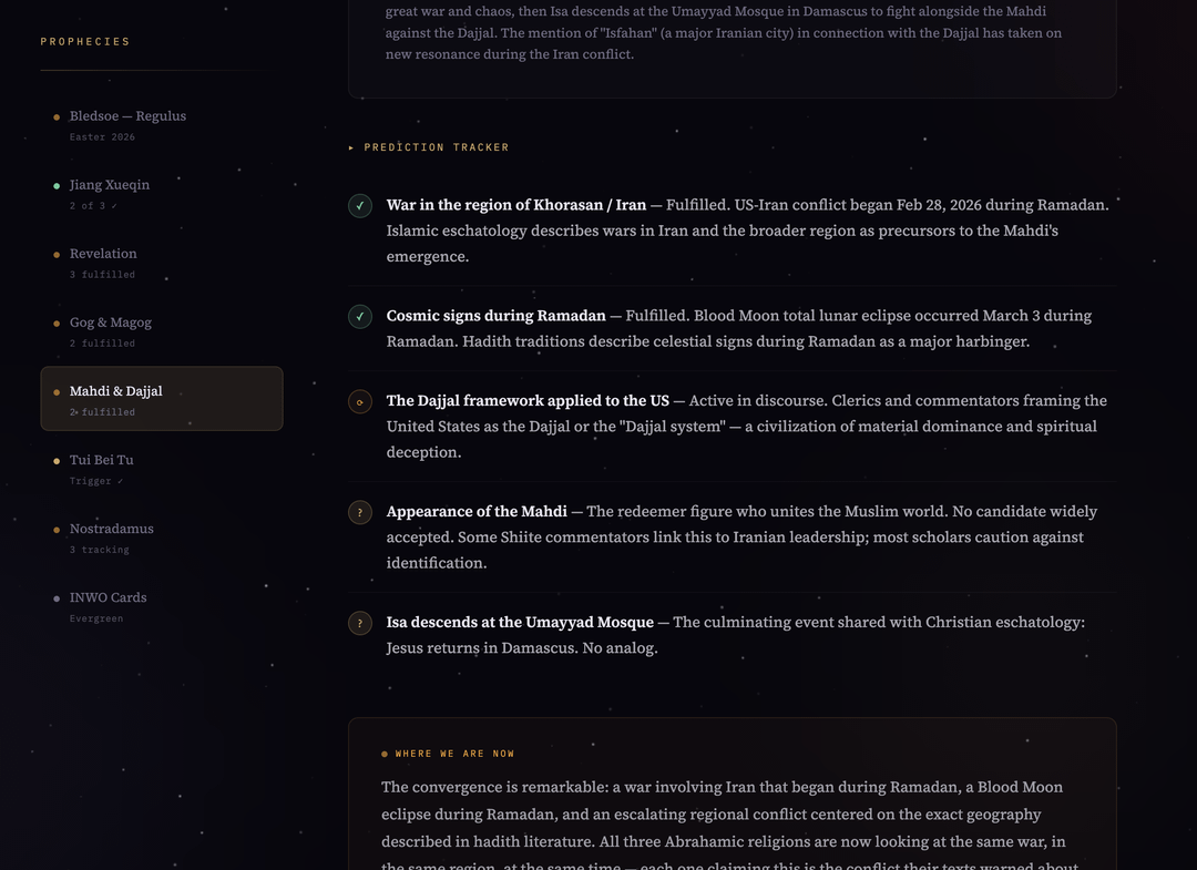 Its not just Judaism and Christianity either. Islamic hadith literature describes wars in the region of Iran as one of the signs before the Mahdi appears. The Iran war started February 28, during Ramadan. The blood moon eclipse fell on March 3, also during Ramadan. In Shiite eschatology the Mahdi's army travels from Iran to Damascus where Isa (Jesus) descends at the Umayyad Mosque and they fight the Dajjal together. Some clerics are already framing the US as the Dajjal. So you've got all three Abrahamic religions looking at the same war in the same region at the same time, each one saying this is the one their texts warned about, and the people on every side of the conflict believe theyre fulfilling their own prophecy.