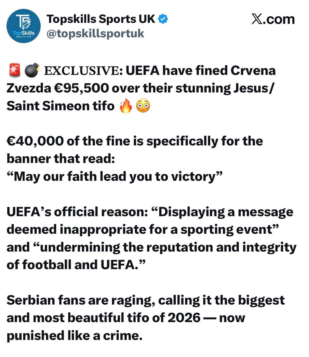 apathywhocares on March 28, 2026 9:42 am UEFA, tackling the big issues. Like corrupt referees, match fixing, and TIFO. FFS