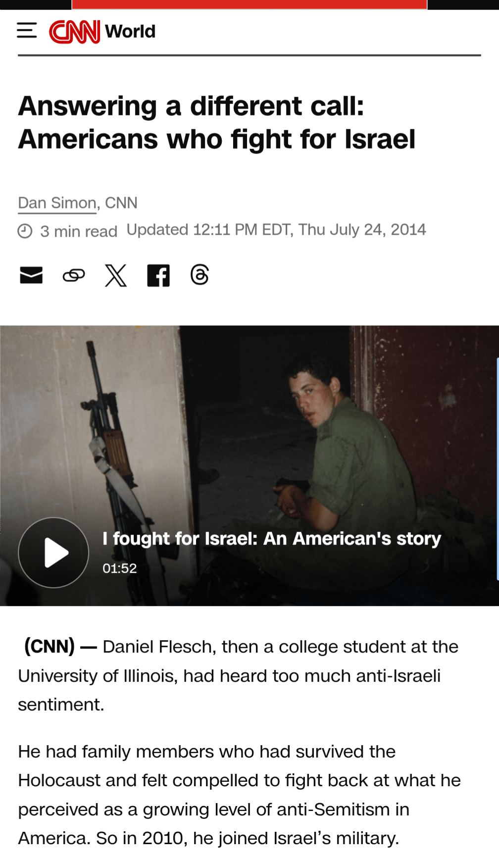 *”felt compelled to fight back at what he perceived as a growing level of anti-Semitism in America”* – Based on that screenshot, his motive for joining Israel’s military makes no sense at all. How does joining a foreign army counter any *”ism”* in your own country?
