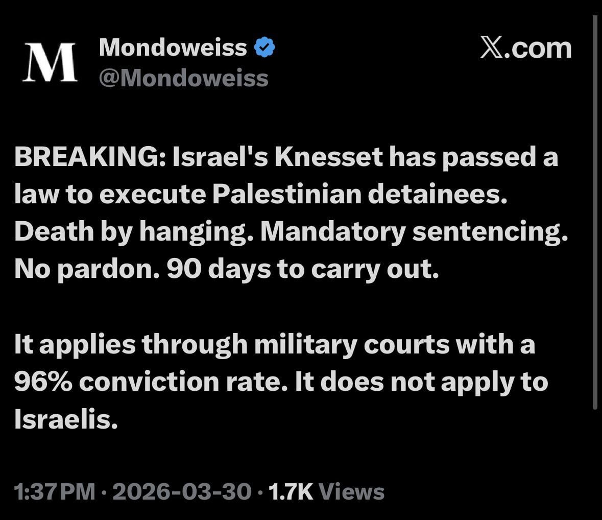 Link in the comment. Someone replied and showed a clip of Ben Gvir celebrating this passage of the law by opening champagne. This is an open genocide now by israel