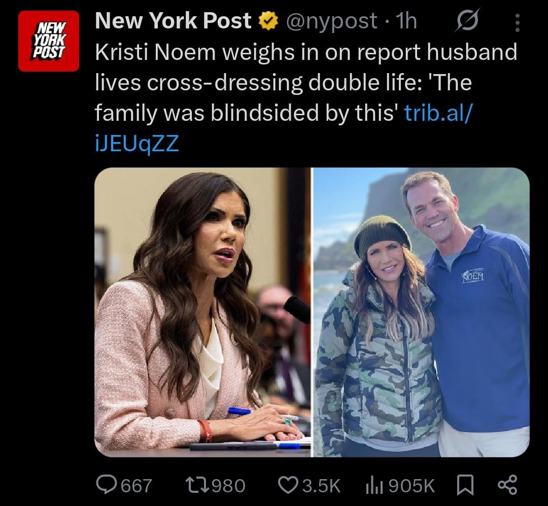 4. I’m convinced the entire story about her husband is made up by Noem. She wants a reason to leave him and go get with her side piece, and instead of just admitting she wants a divorce, she has to ruin his life and make him look like the problem. Noem is evil.